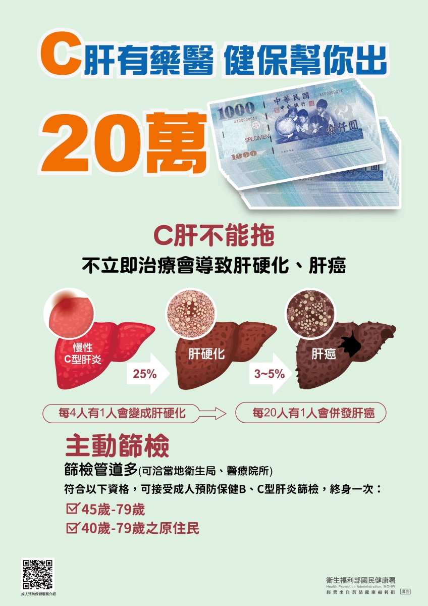 由於 C 型肝炎的治癒率高達 98%,而且其中治療所需的藥物費用 20 萬元,全由健保給付。早篩早發現,以利及早治療,可減少肝炎病程所帶來的身體損傷,存好自己的健康本。