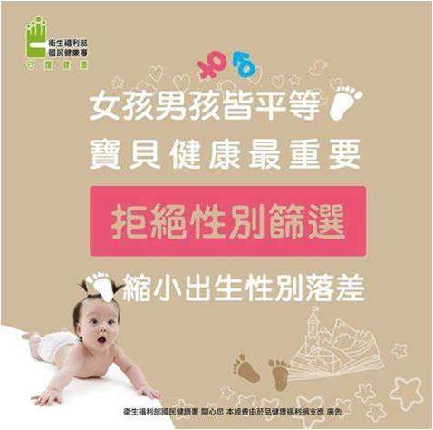 隨著我國性別平等政策倡議與推動,男女平等議題普遍受到重視,現今社會不論在家庭角色、工作職場等各面向,性別差異皆已淡化。國民健康署持續呼籲民眾擺脫舊式重男輕女、傳宗接代的落伍觀念,珍惜每一個即將來到世上的小生命,女孩、男孩一樣好,都是家中獨一無二、最珍貴的寶貝!