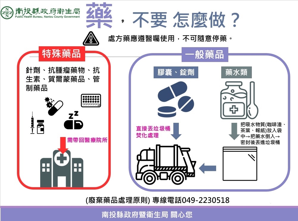 2.可判別或一般藥品則丟至一般垃圾袋給垃圾車處理。(但如果是「藥水」,請將藥水倒出,以咖啡渣、茶葉渣、擦手紙吸附後,再丟棄至垃圾袋中,空瓶則進行塑膠類回收)。