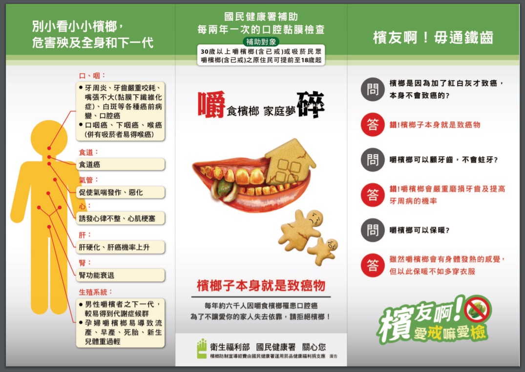 台灣地區約 9 成口腔癌患者有嚼檳榔習慣,且在台灣的齒齦癌和頰黏膜癌是口腔癌主要型態,主要是因嚼檳榔者把檳榔嚼塊置於齒齦和頰黏膜間直接接觸的關係這兩種型態的癌症在非嚼檳榔地區較少發生,可見嚼檳榔和口腔癌之相關性高。 嚼食檳榔會有口腔黏膜下纖維化症、白斑、紅斑、疣狀增生等癌前病變除了會引起口腔癌外,還可能造成咽癌和食道癌;此外檳榔纖維粗糙加上有石灰,嚼食後牙齒易磨損,口腔內會藏細菌也容易造成牙周炎。如果口腔黏膜增加、有腫塊或潰瘍長久不癒,很可能就是口腔癌的徵兆,應該提高警覺、及早發現及早治療;但預防口腔癌並不難,且要把握「治療黃金期」!國民健康署提供30歲(含)以上有嚼檳榔或吸菸的民眾每2年免費1次口腔癌篩檢,如果篩檢結果有癌前病變或癌症病灶,只要盡早接受治療,依目前的醫療技術,對於外表與語言並不會造成很大的影響。善用國民健康署提供的戒菸戒檳服務,一起降低口腔癌的發生率。