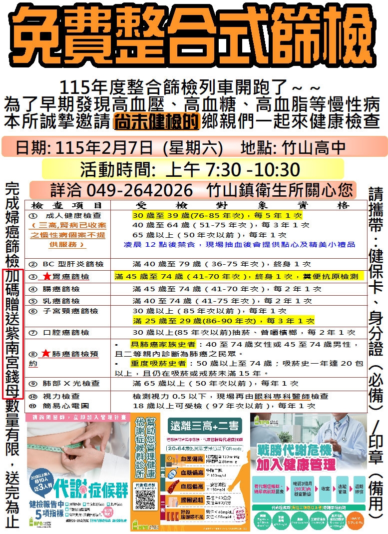 ☎️洽詢電話:049-2642026 竹山鎮衛生所 關心您🥰