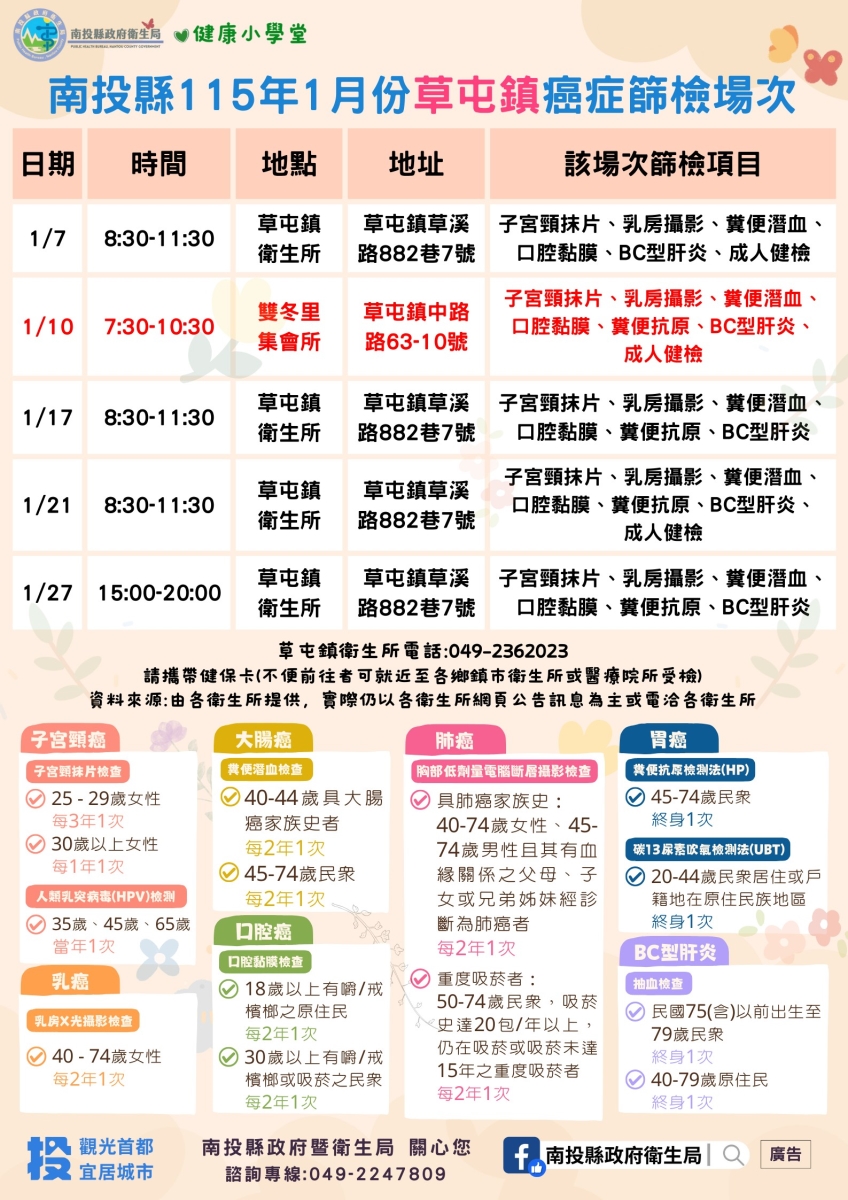 📣南投縣115年1月份成人健檢及癌症篩檢活動快訊📣