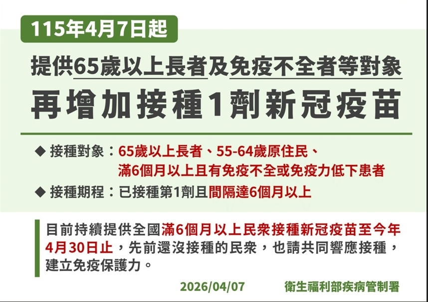 疾病管制署(下稱疾管署)表示,考量65歲以上長者(原住民為55歲以上)、免疫不全或免疫力低下患者為感染後易發生重症或死亡之高風險族群,為提升對高風險族群的健康保護,參考國際接種建議,並經衛生福利部傳染病防治諮詢會預防接種組(ACIP)會議討論,自今(2026)年4月7日起提供65歲以上長者、55-64歲原住民、滿6個月以上且有免疫不全或免疫力低下患者再增加接種1劑新冠疫苗,與前1劑間隔至少6個月(180天)。目前新冠疫苗已接種超過166萬人,其中65歲以上長者已累計接種約100萬人,其中約有75萬人可在今年4月底接種第2劑,呼籲符合接種條件民眾踴躍接種。另外先前還沒接種的民眾,也可踴躍接種,建立免疫保護力。 疾管署說明,本季新冠疫苗自去(2025)年10月1日起提供民眾接種,重症病例以65歲以上長者(占73%)及具慢性病史者(占81%)為多,93%未接種本季新冠疫苗。疫苗保護力會隨著時間遞減,鼓勵接種已達6個月之長者及免疫不全者等重症高風險對象儘快安排接種第2劑新冠疫苗(莫德納及Novavax擇一廠牌接種,可與第1劑不同廠牌),以再提升免疫保護力,減少疾病威脅。其中滿6個月以上且有免疫不全或免疫力低下患者,包括目前正進行或1年內曾接受免疫抑制治療之癌症患者、器官移植患者/幹細胞移植患者、中度/嚴重先天性免疫不全患者、洗腎患者、人類免疫缺乏病毒感染患者、目前正使用高度免疫抑制藥物者、過去6個月內接受化學治療或放射線治療者,以及其他經醫師評估有免疫不全或免疫力低下者。 疾管署強調,國內與國際間新冠病毒傳播風險持續,接種新冠疫苗仍是預防新冠併發重症最有效的方法,新冠併發重症本土病例有9成以上未接種本季新冠疫苗,並以 65歲以上長者(占73%)及具慢性病史者(占81%)為多。國內供應之兩種廠牌公費新冠疫苗對於目前國內外主流變異株均安全有效,且國內新冠疫苗不良事件通報情形已下降與流感疫苗相當,無觀察到須立即採取相關措施之安全疑慮,提醒民眾別因過往接種經驗而擔憂副作用影響。此外,公費新冠疫苗擴大提供全國滿6個月(180天)以上民眾接種措施已延長至今年4月30日止,全家皆可接種新冠疫苗,請扶老攜幼共同接種,尤其家中如有65歲以上長輩尚未接種或已接種第1劑且間隔達6個月,請鼓勵長輩們前往接種,保護自己也保護家人之健康,共同降低重症和死亡發生風險。