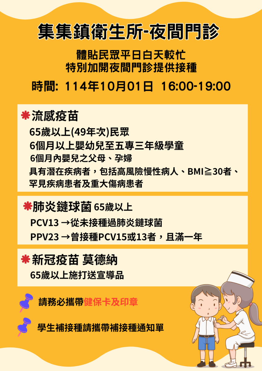 為服務65歲(民國49年次)民眾施打流感需求,10月1日晚上特別加開流感預防針施打。