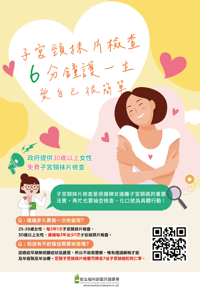 1.30歲以上女性:每年可接受一次免費子宮頸抹片檢查,25-29歲女性每3年一次。