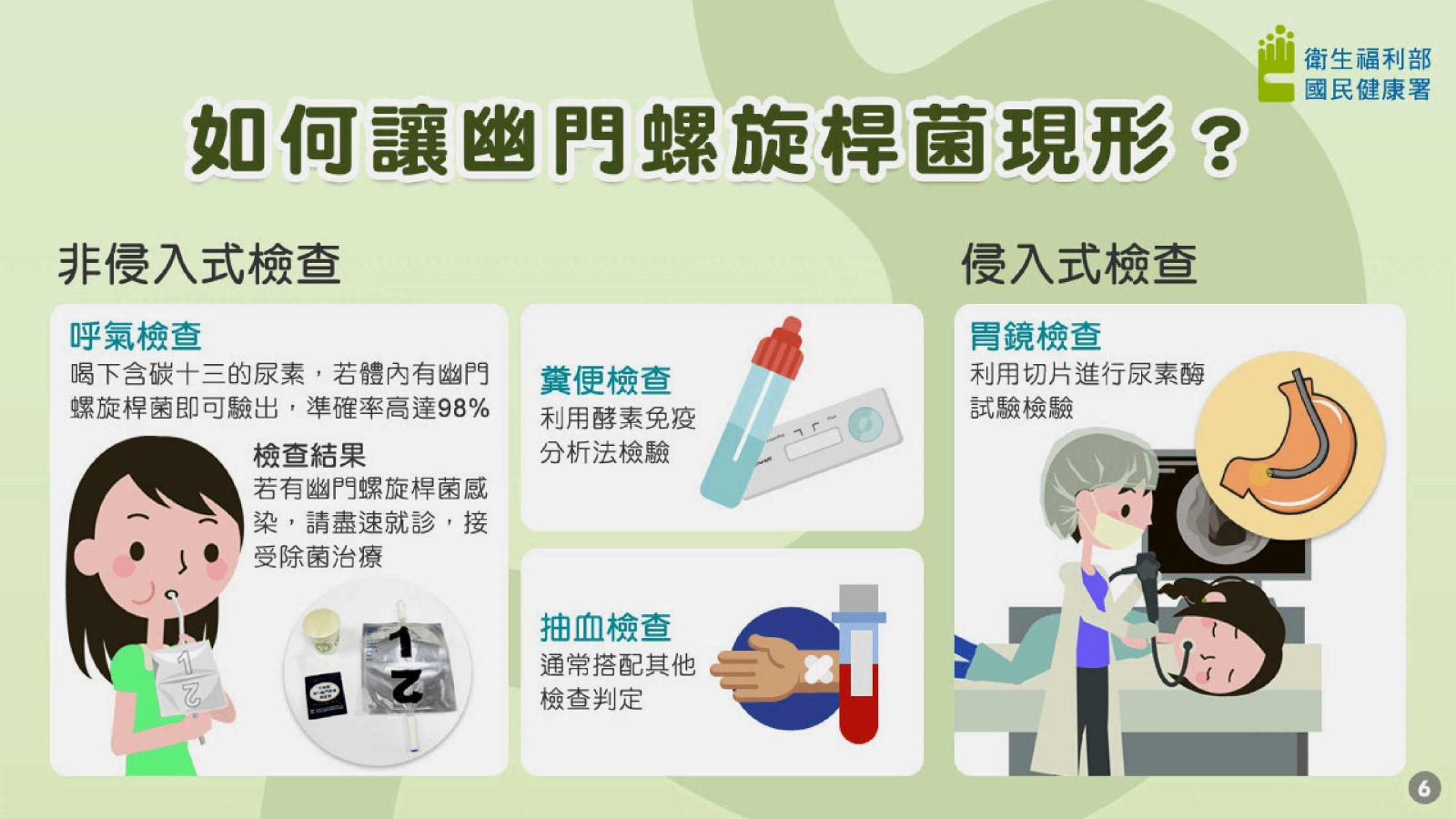 自113年8月起於9個縣市試辦終身1次以糞便抗原檢測胃幽門螺旋桿菌;114年擴大試辦,有17縣市參與試辦,如民眾符合45至74歲篩檢資格,可先洽詢所在地衛生所,如檢測結果為陽性,無須驚慌,請依醫師指示回診,並遵循醫囑接受除菌藥物或進一步檢查等醫療處置,只要及早發現並進行幽門螺旋桿菌除菌治療,胃癌的發生率會大幅降低。