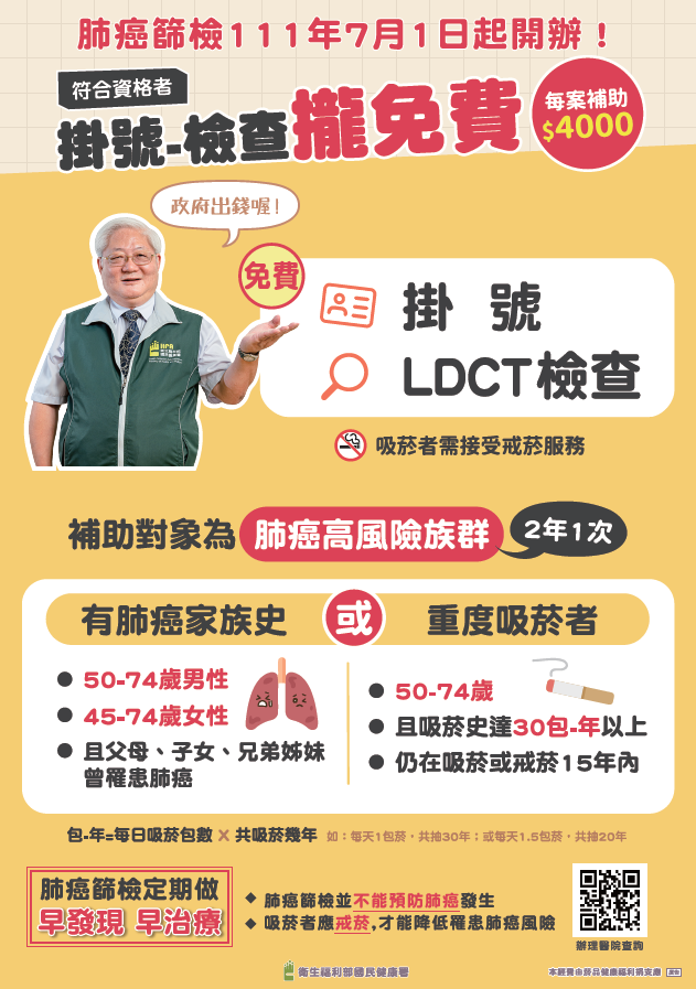 肺癌的發生是多重因子交互作用的結果,其中影響較大的風險因子,除了吸菸之外,還包括了家族史。為降低肺癌對國人健康的威脅,我國依據國內外研究實證,持續推動公費肺癌篩檢,針對重度吸菸者及具肺癌家族史者,凡具健保身分且符合以下任一資格之民眾,可每2年接受1次LDCT檢查服務: