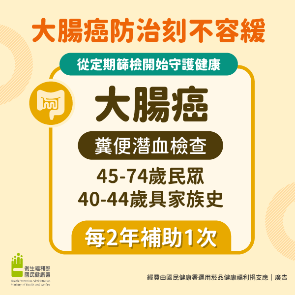 國民健康署自114年起擴大補助45至74歲者及40至44歲有家族病史(其父母、兄弟姊妹或子女曾患有大腸癌)者,每2年可接受一次公費糞便潛血檢查。實施一年以來,受檢人數已逾167萬,比前一年同期增加3成,其中新增45至49歲及40-44歲有家族史之目標族群30.8萬人,占整體篩檢人數18.4%,顯示擴大篩檢有助於提升民眾的篩檢覆蓋率。