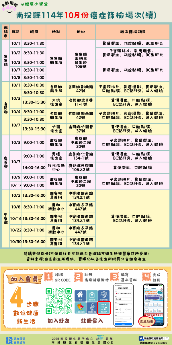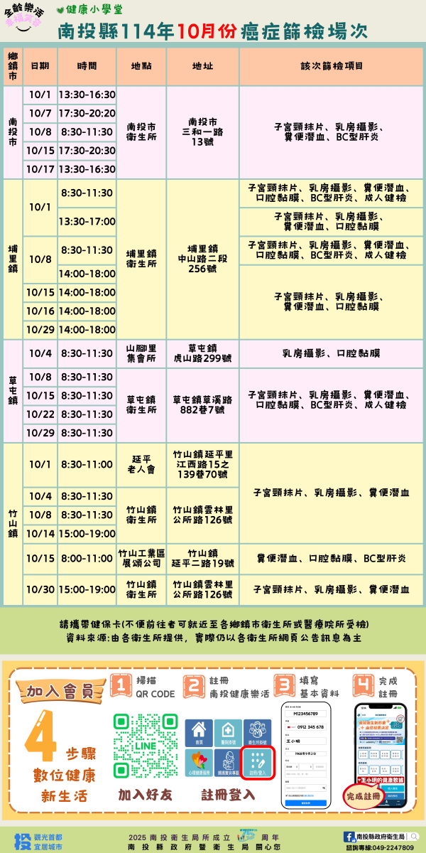 📣南投縣114年10月份成人健檢及癌症篩檢活動快訊📣