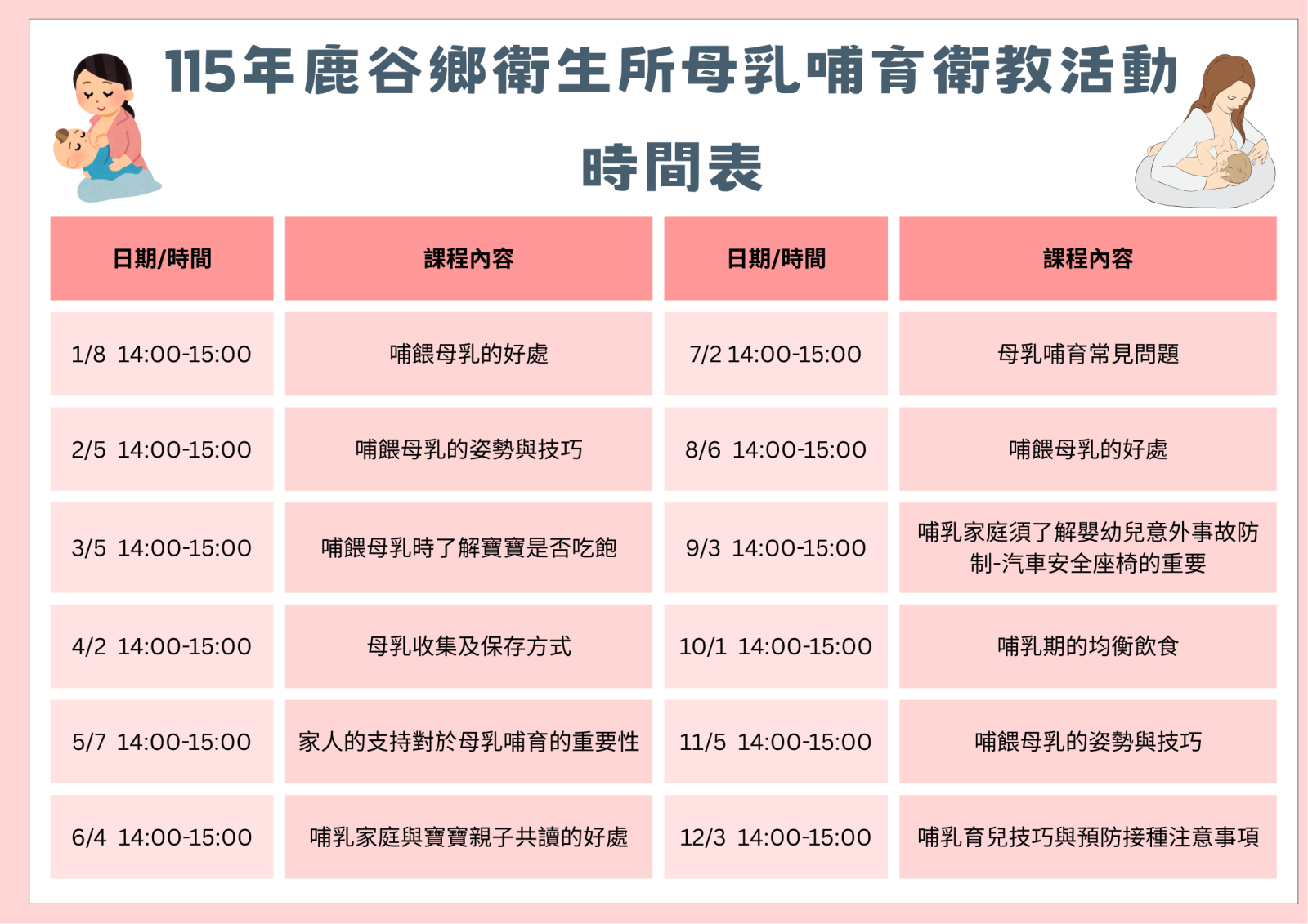 【115年鹿谷鄉衛生所母乳哺育衛教活動時間表】來囉~