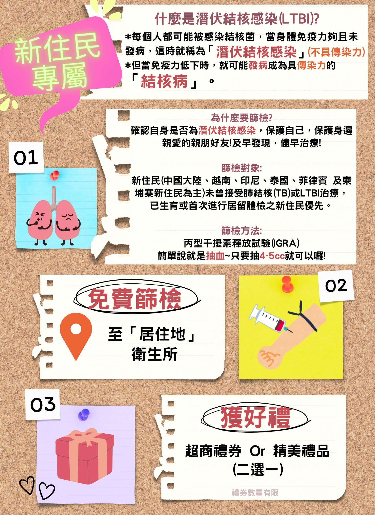 若您未曾接受過結核病或潛伏結核感染治療的姊妹們快來參加!檢驗陽性者需接受預防療程,才能有效降低結核病發病風險,名額有限,要搶要快!完成相關檢查還有300元等值禮券。