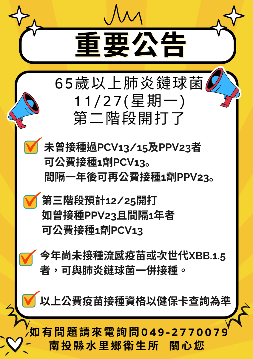 [好消息] 65歲以上肺炎鏈球菌疫苗 11/27(星期一)第二階段開打囉!