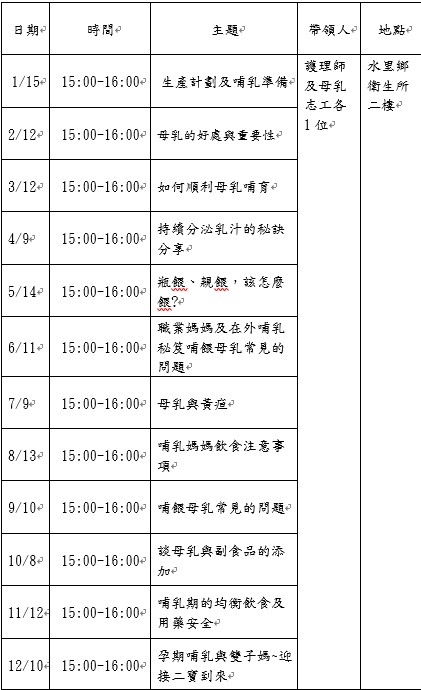 115年度水里鄉衛生所母乳哺育支持團體時間表