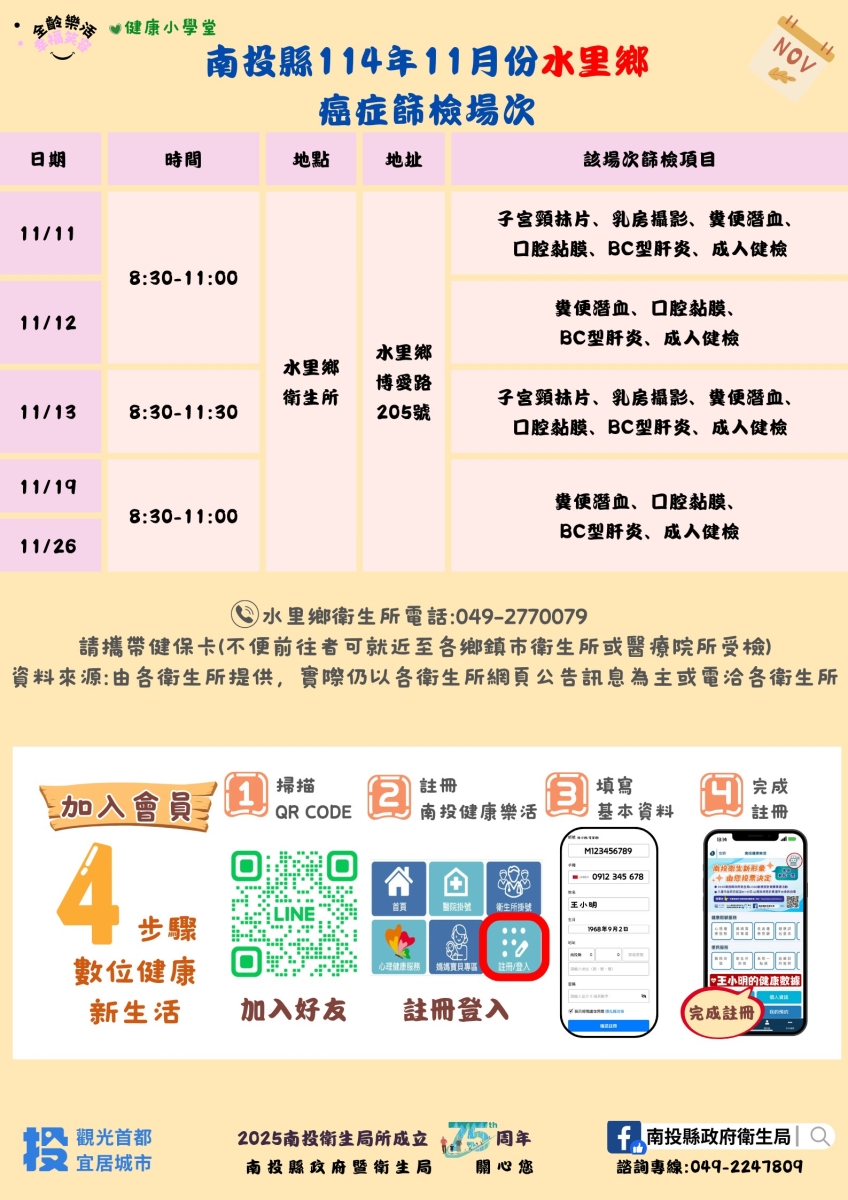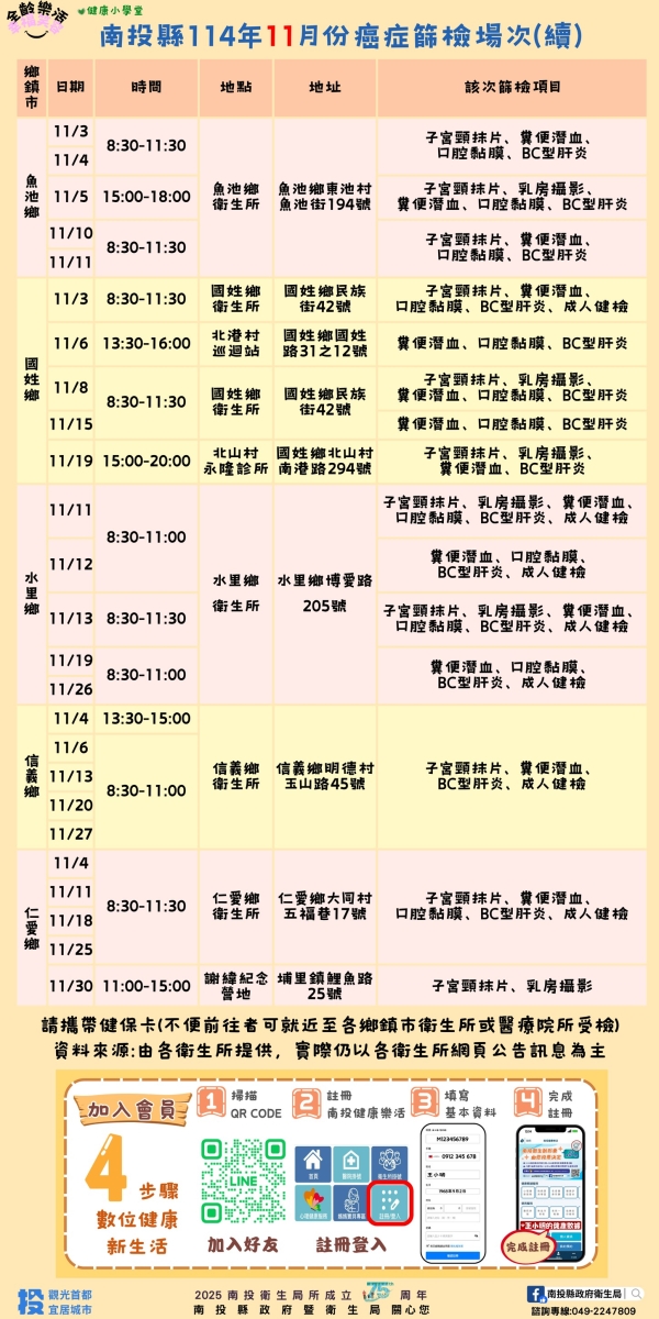 📣南投縣114年11月份成人健檢及癌症篩檢活動快訊📣