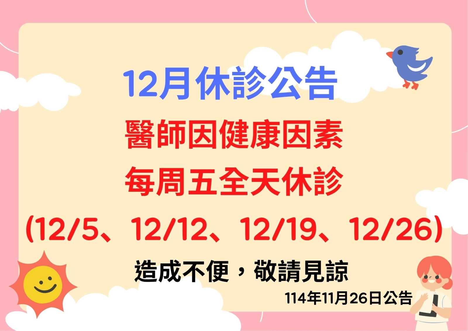 ⚠️[門診公告]⚠️ 114年12月份每週五休診
