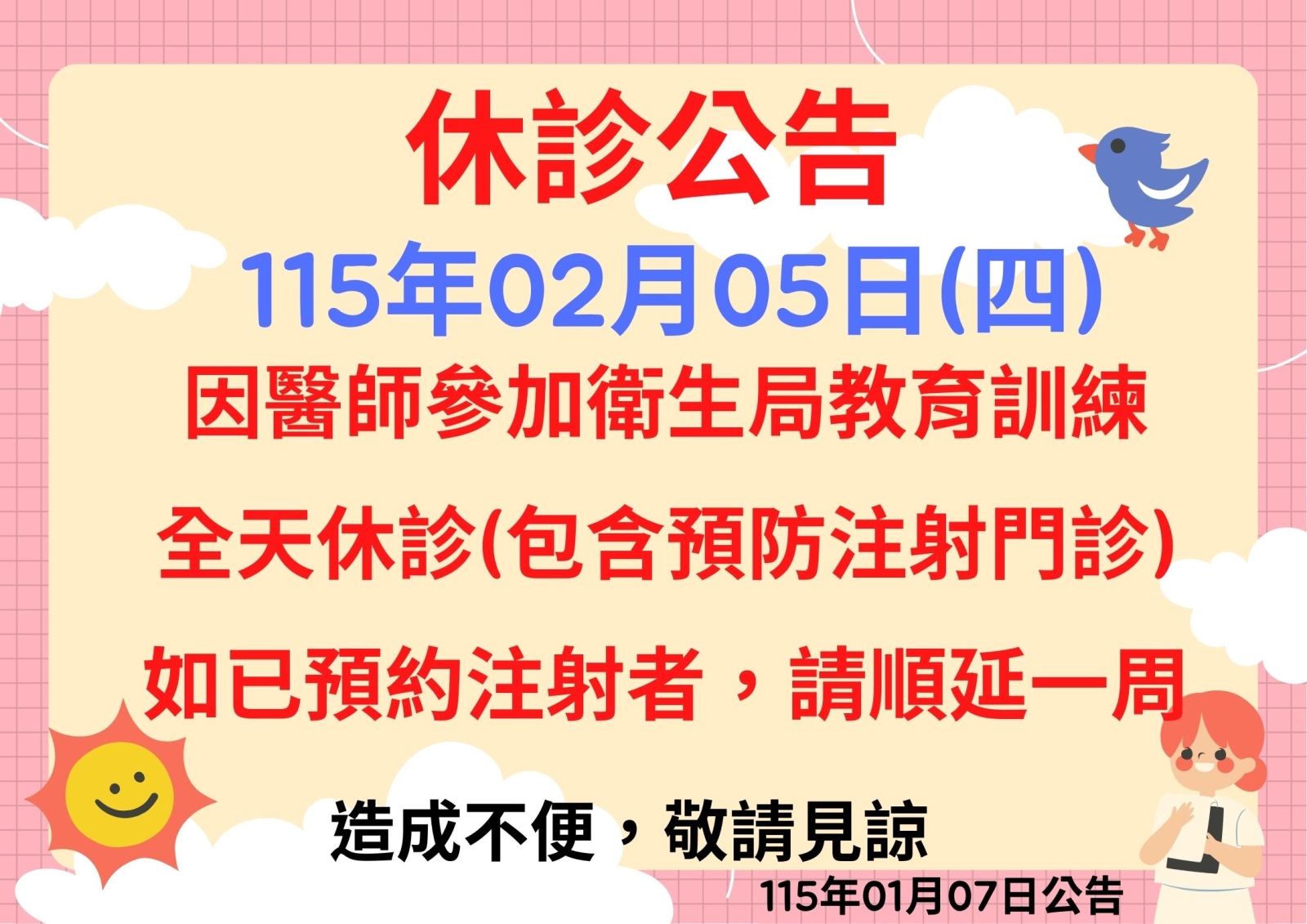 📢 休診公告 📢 115 年 02 月 05 日(四) 全天休診(包含預防注射門診)