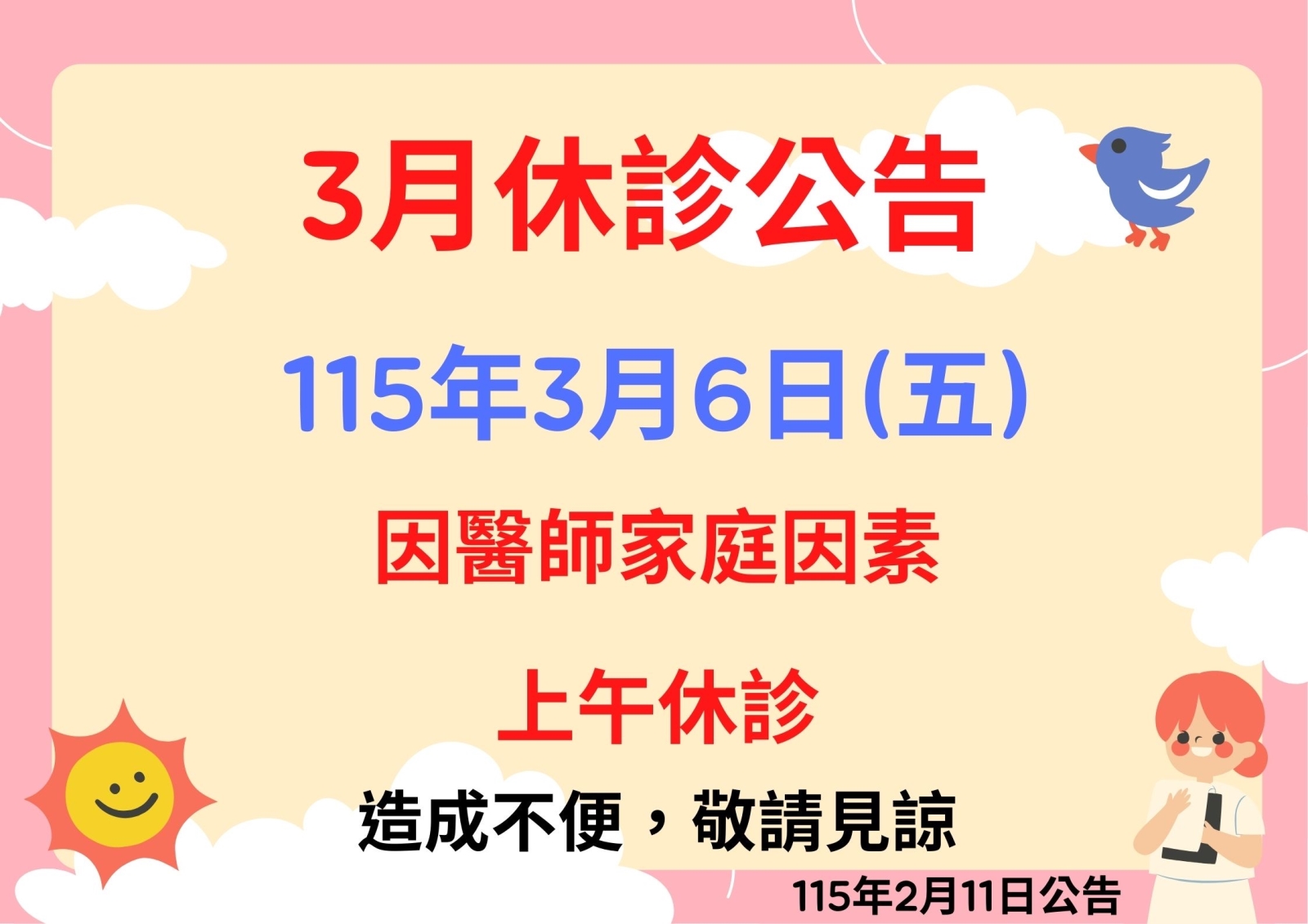 ⚠️[休診公告]⚠️ 115年03月06日(五) 上午休診