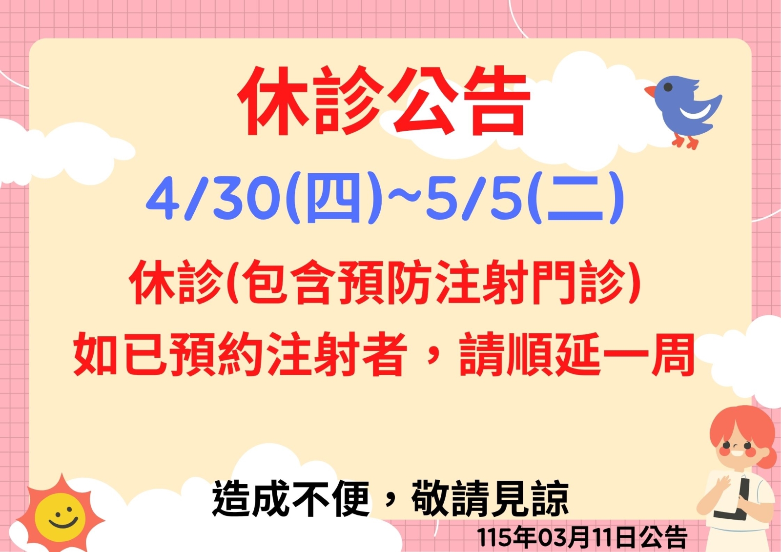 📢 休診公告📢 04 月 30 日(星期四)~ 05 月 05 日(星期二)休診