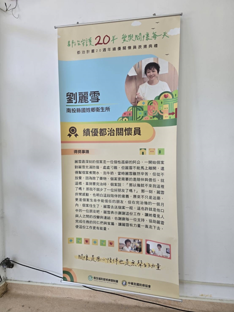 國姓衛生所都治關懷員劉麗雪,獲得今年度疾管署「都治計畫20週年績優關懷員表揚典禮」表揚,感謝她長期為結核病防治的付出。