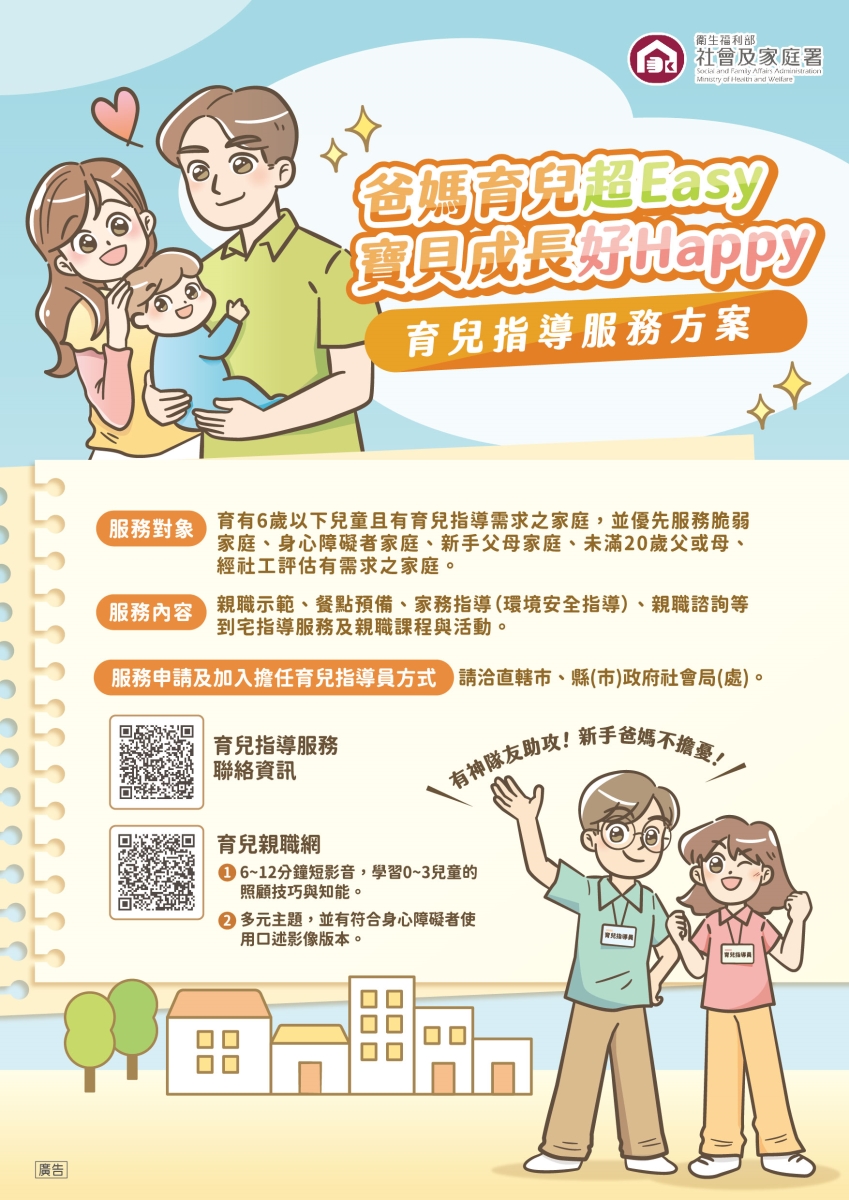 為協助新生兒家庭在育兒初期獲得即時支持,衛生福利部社會及家庭署持續擴大推動「育兒指導服務」,由專業人員提供到宅或電話等方式之育兒指導,陪伴家長安心照顧寶寶。