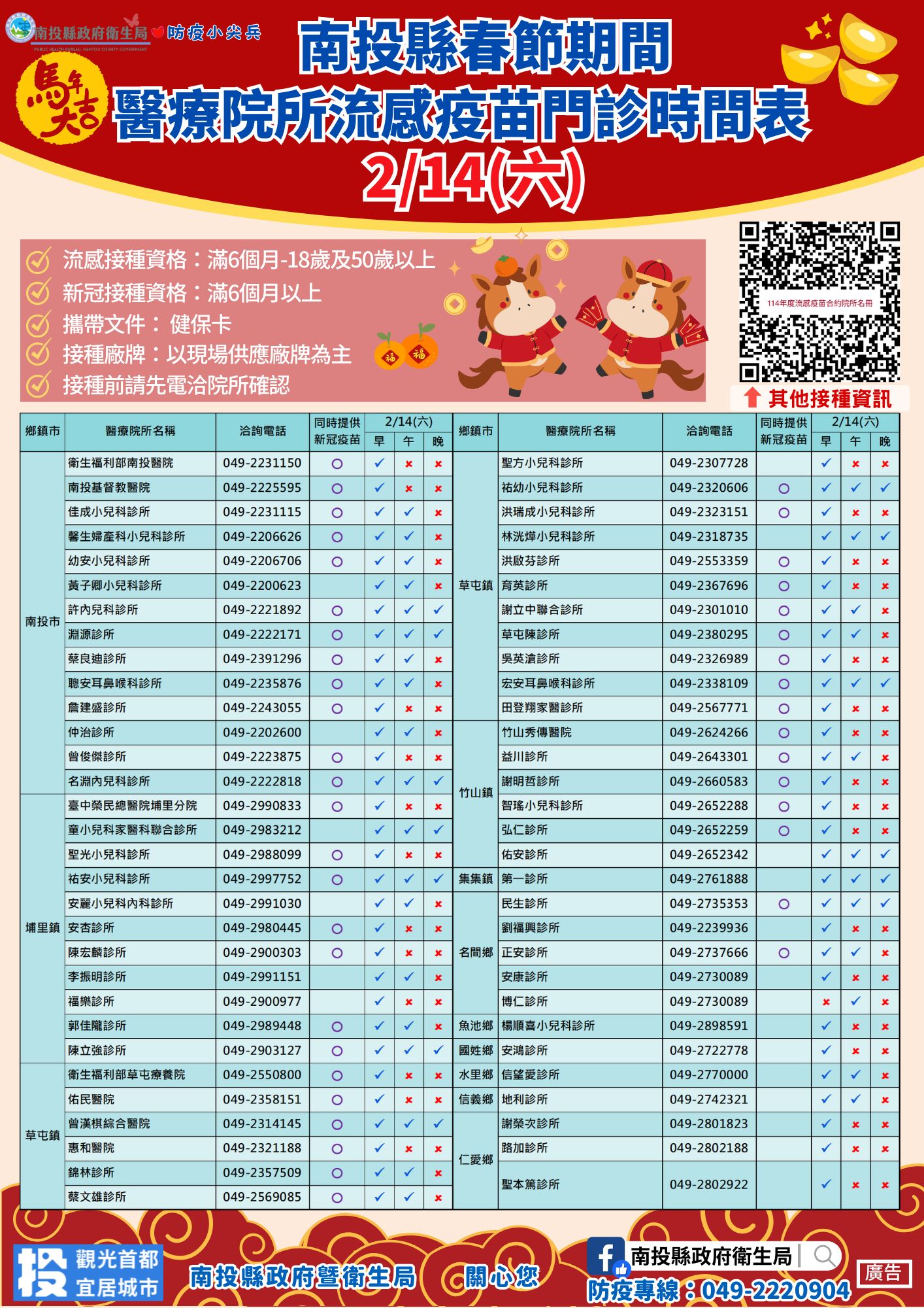 2/14 南投縣春節期間醫療院所流感及新冠疫苗門診時間