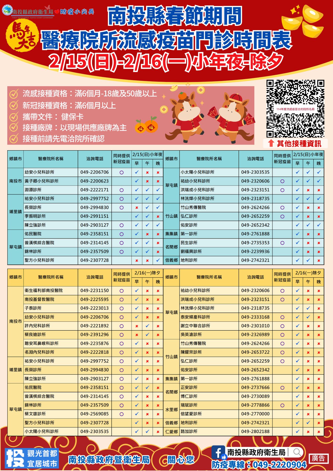2/15-16 南投縣春節期間醫療院所流感及新冠疫苗門診時間