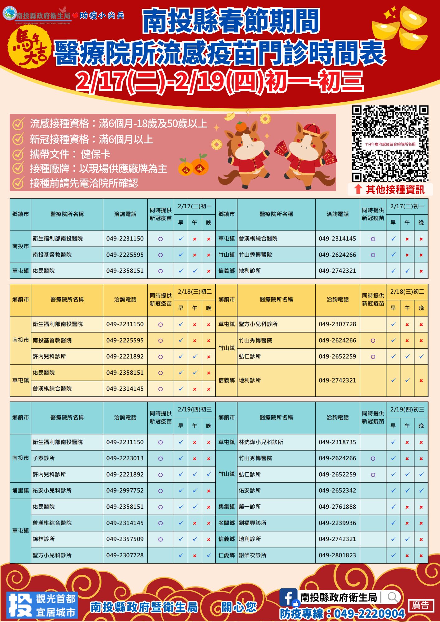 2/17-19 南投縣春節期間醫療院所流感及新冠疫苗門診時間