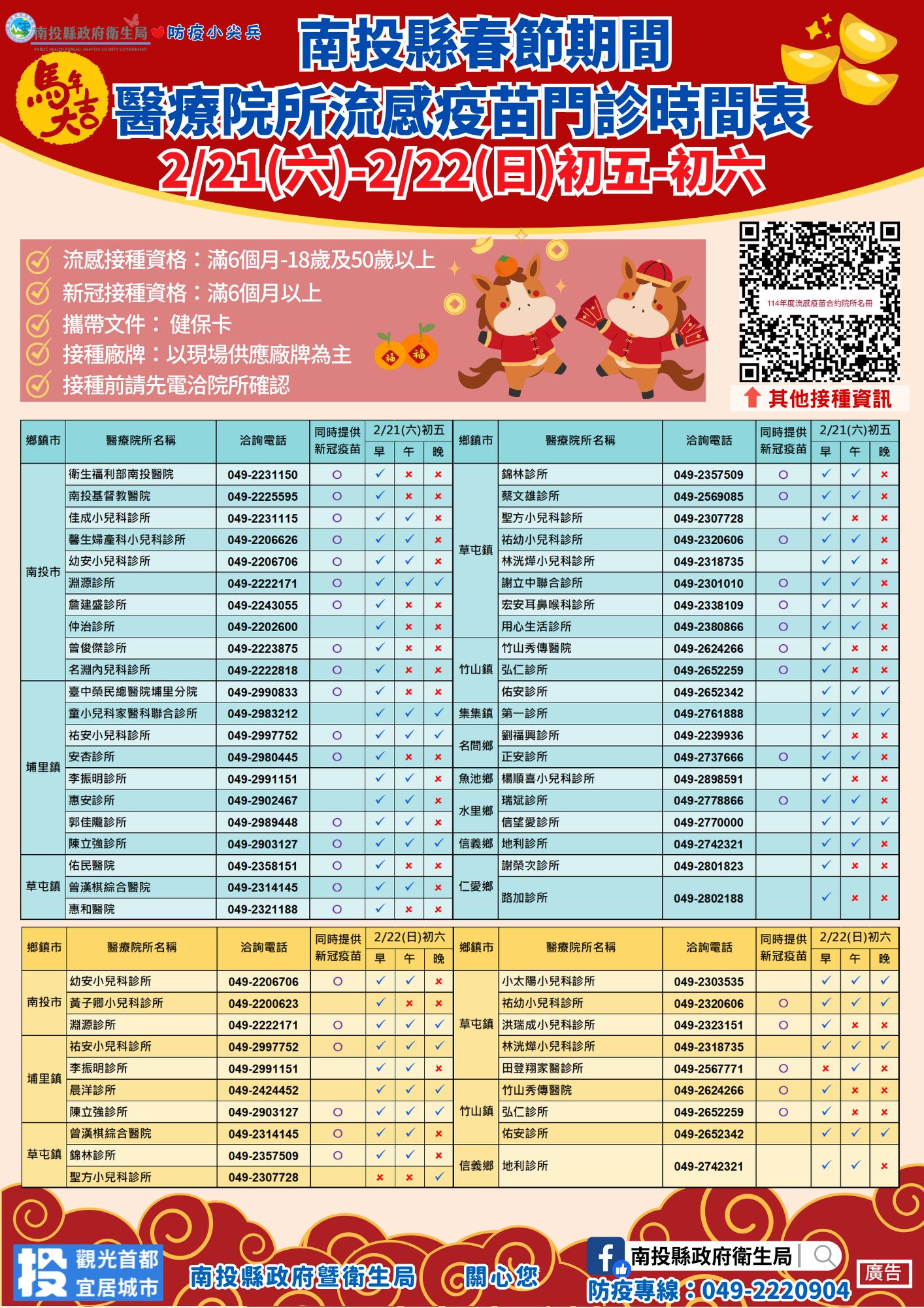 2/21-22 南投縣春節期間醫療院所流感及新冠疫苗門診時間