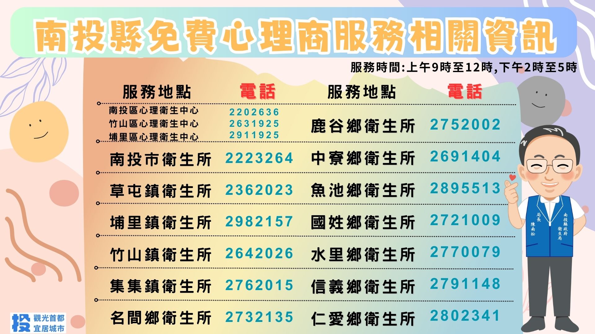 | 衛生福利部南投醫院 | 南投市復興路478號 | 2231150 | 可視訊諮商 |