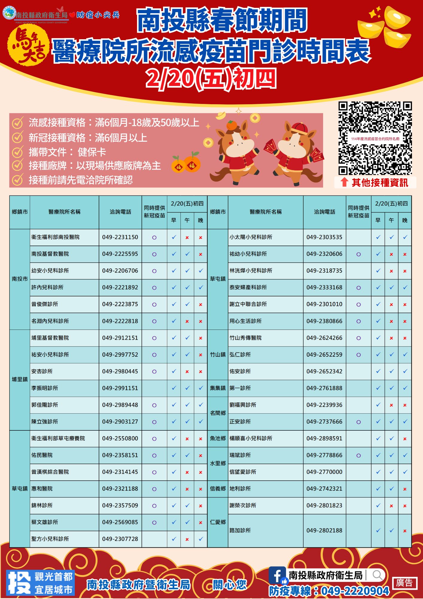 2/20 南投縣春節期間醫療院所流感及新冠疫苗門診時間