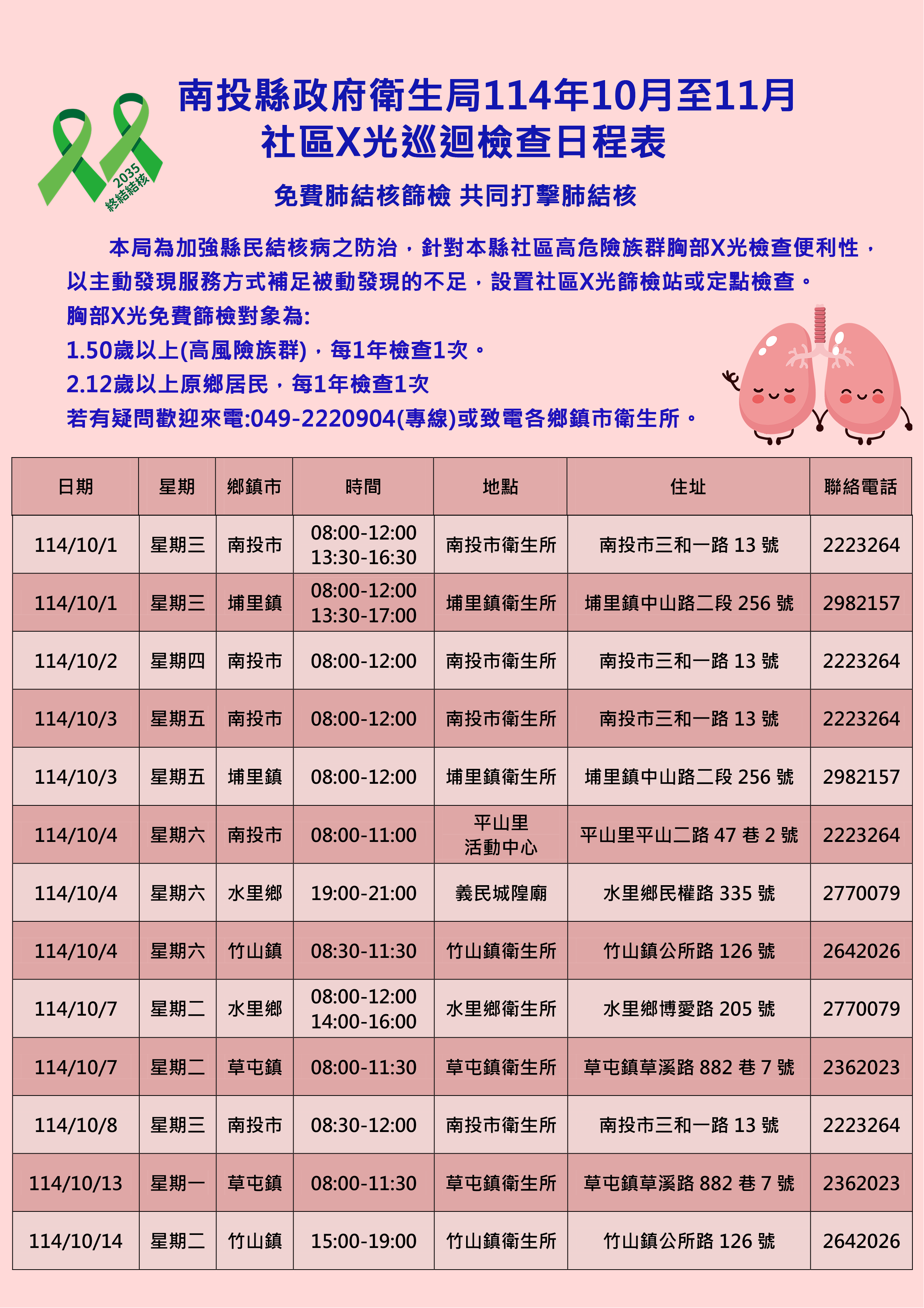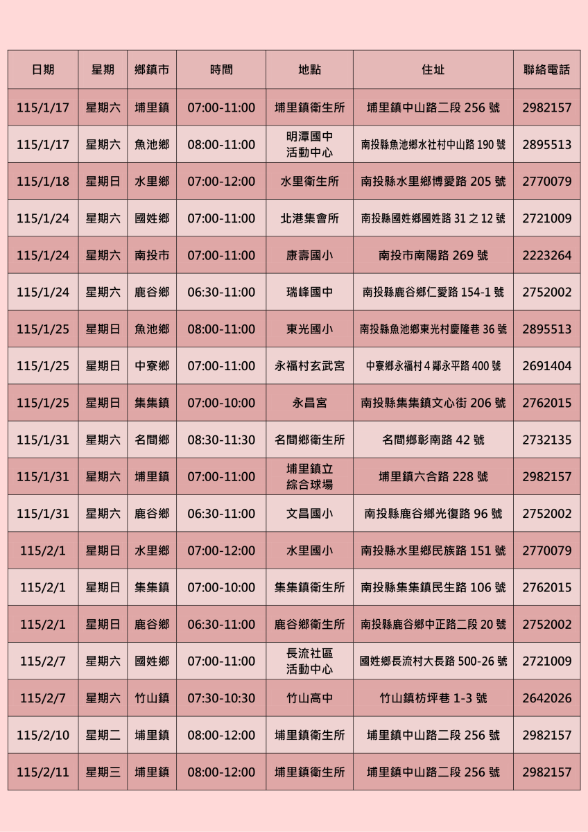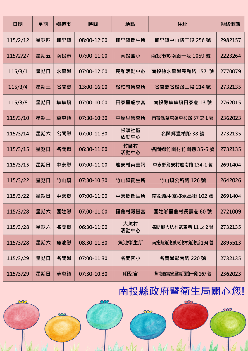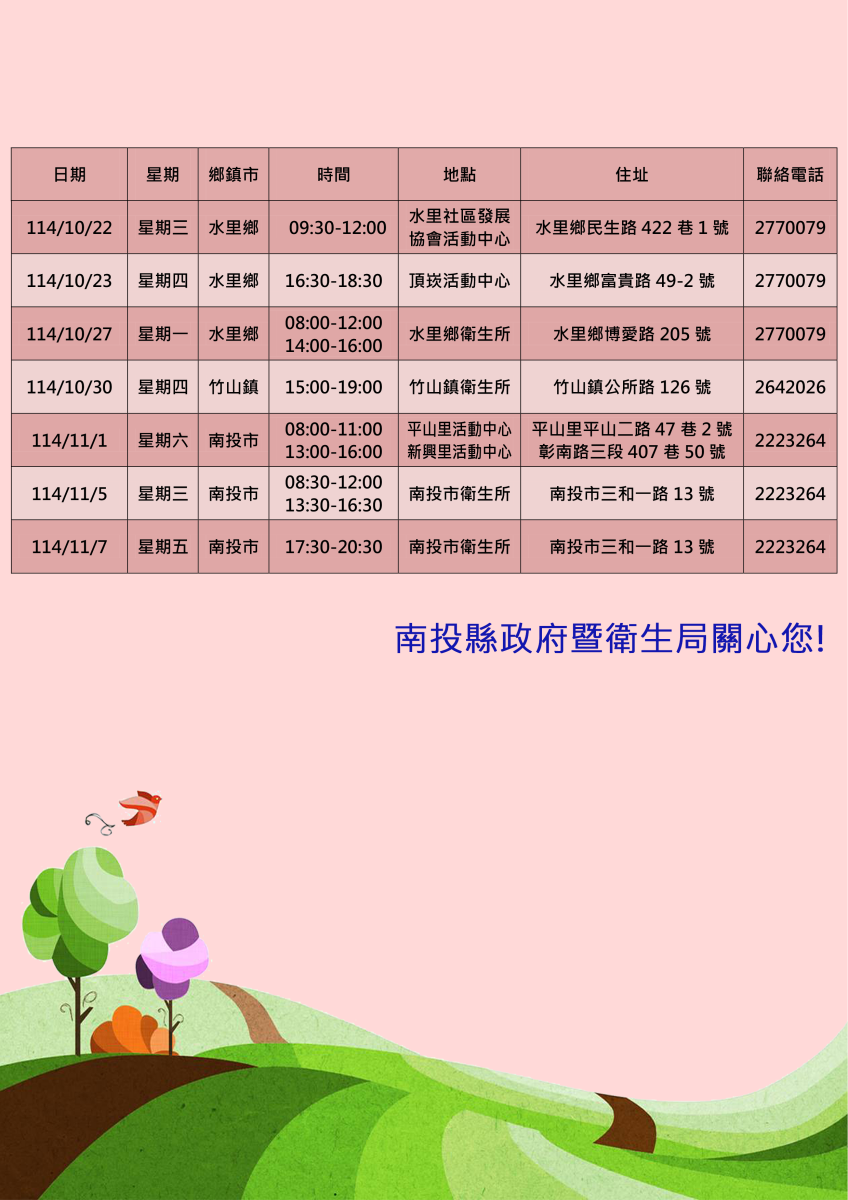 若有疑問歡迎來電:049-2220904(專線)或致電各鄉鎮市衛生所