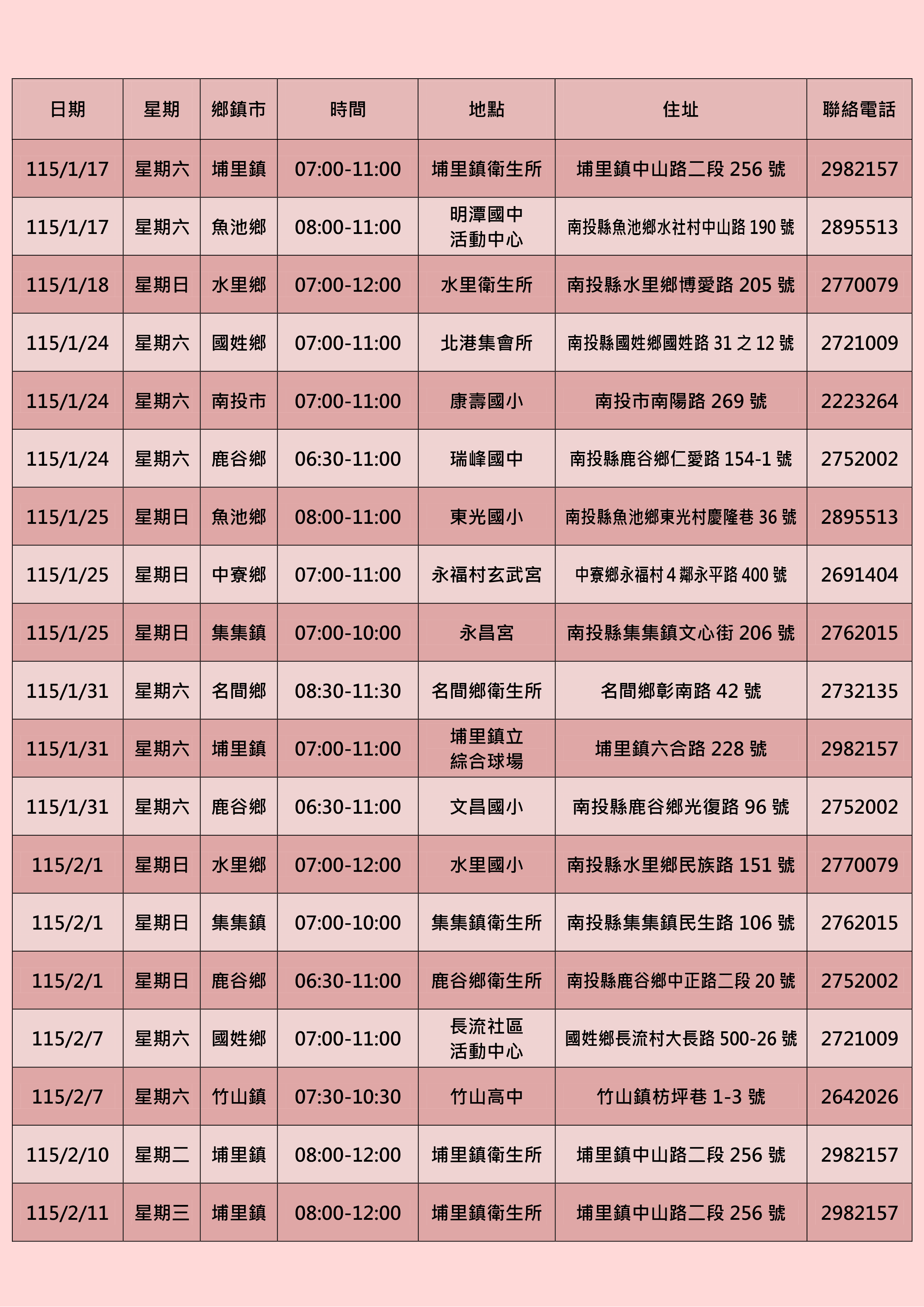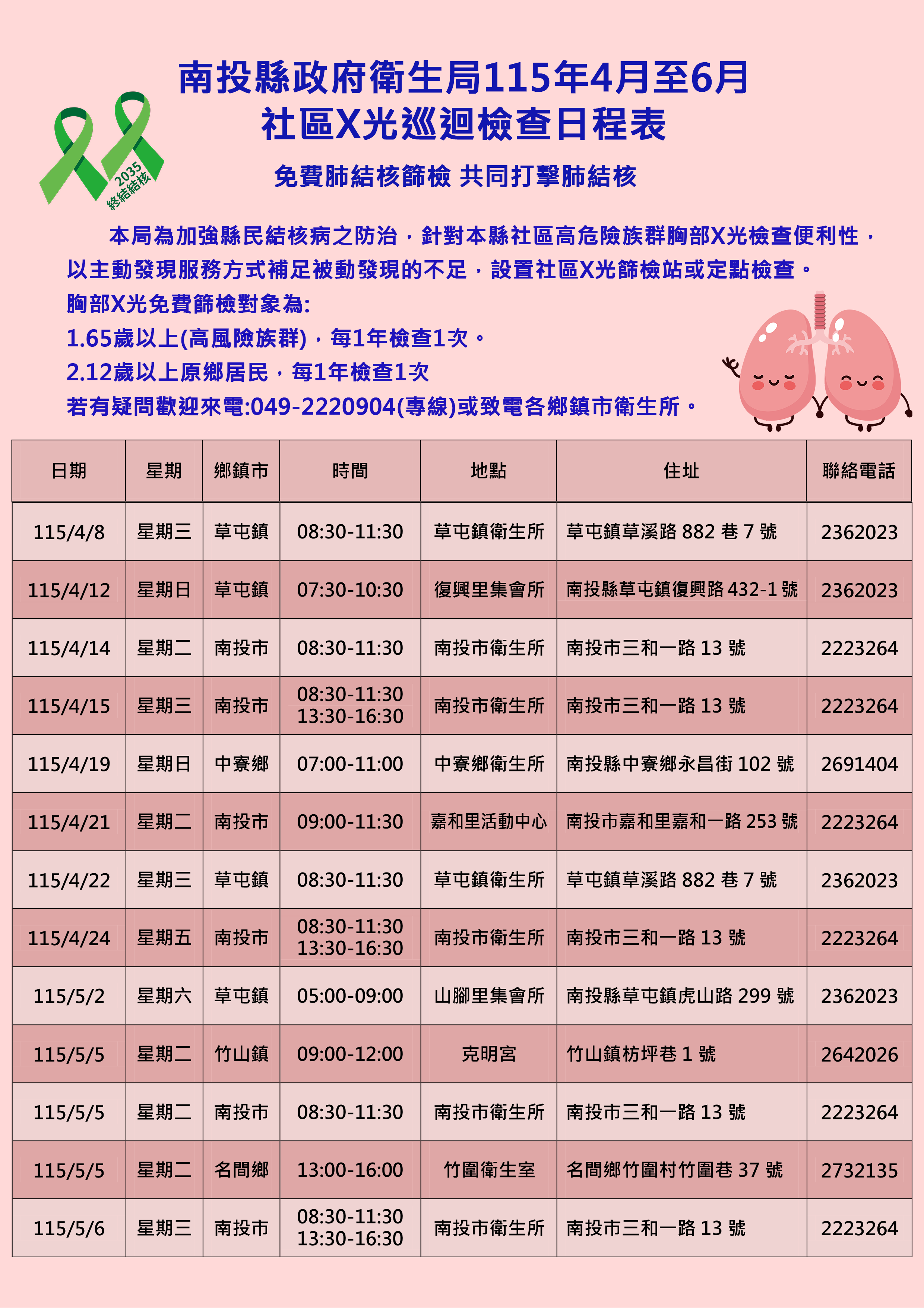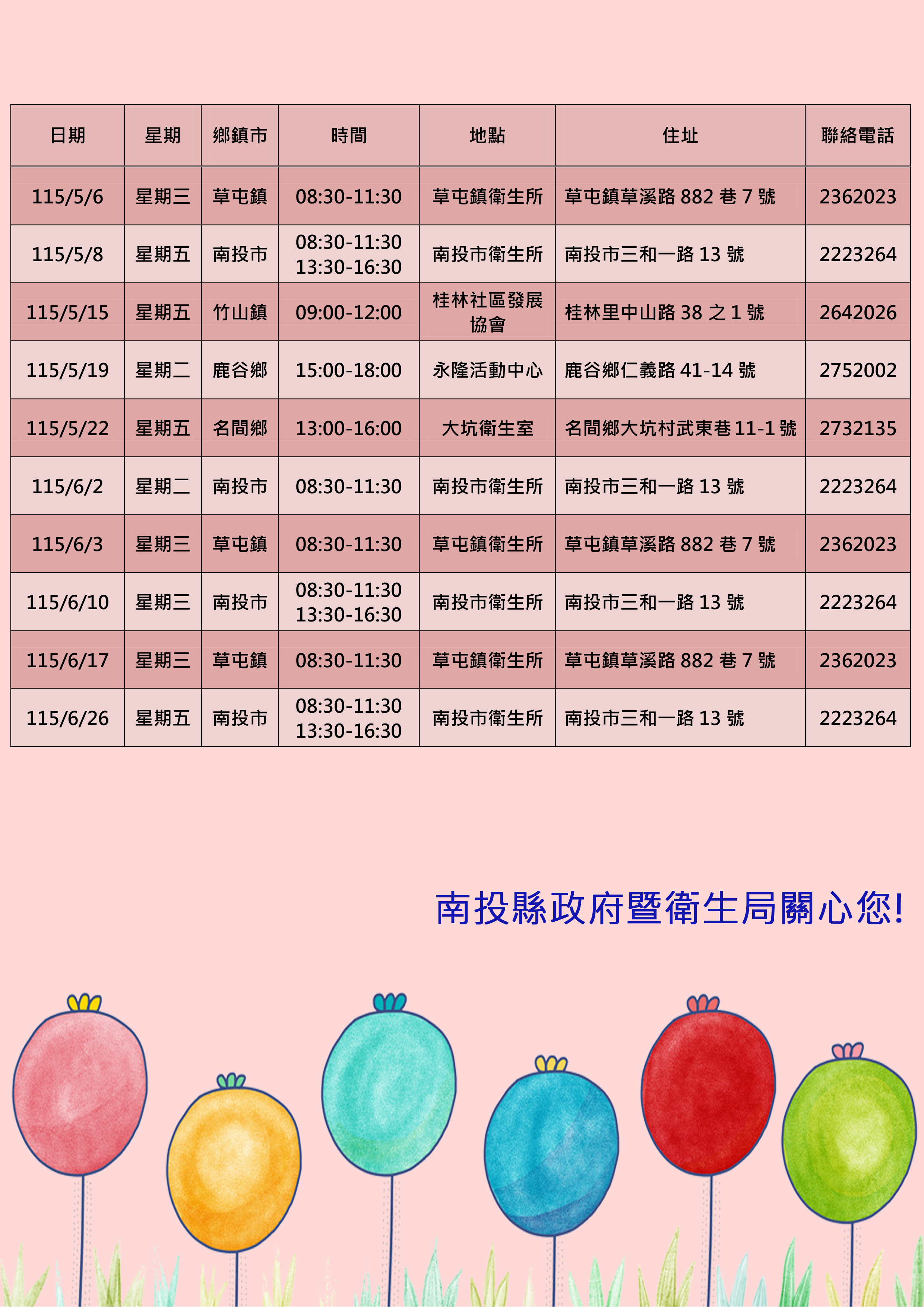 若有疑問歡迎來電:049-2220904(專線)或致電各鄉鎮市衛生所