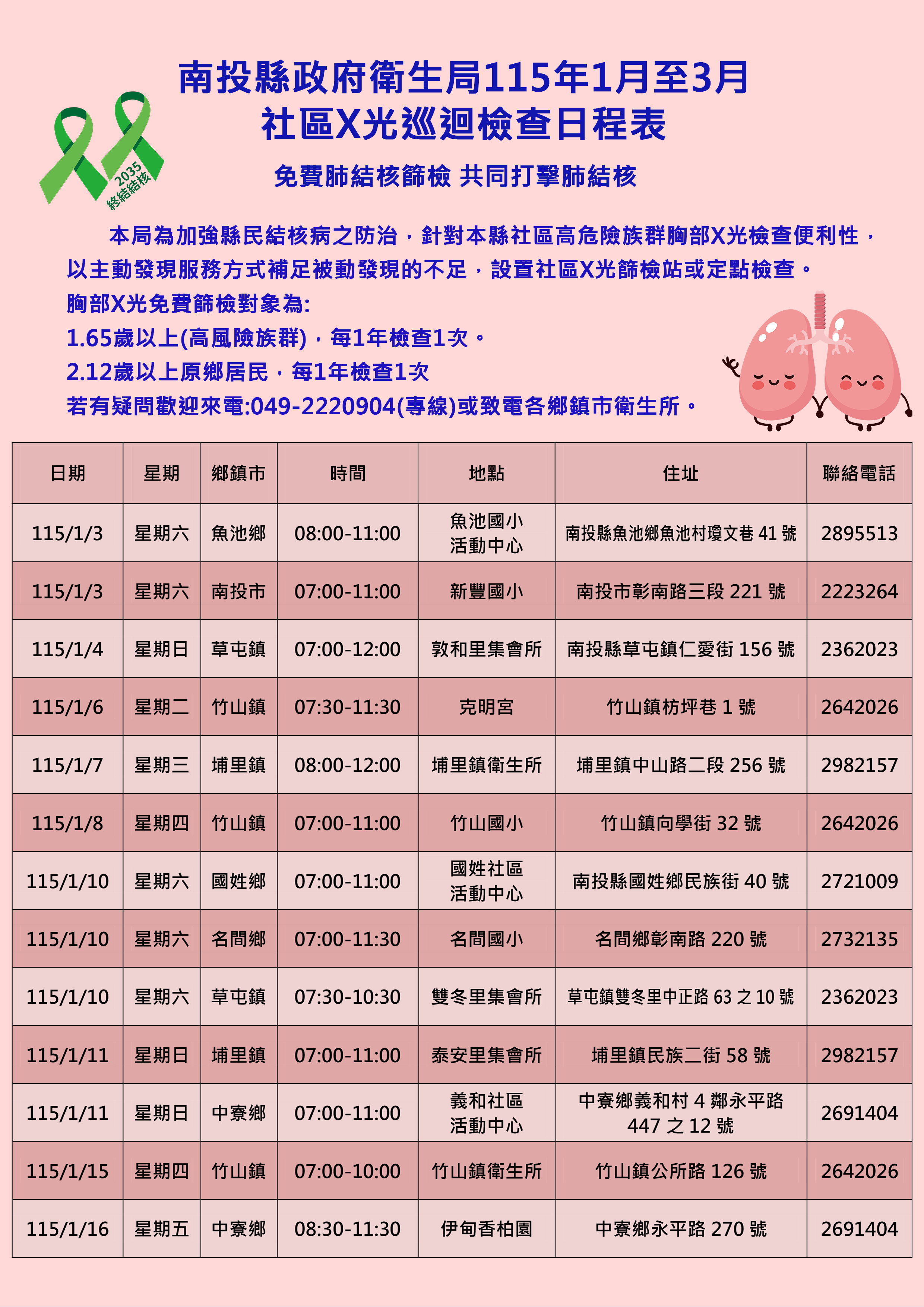 本局為加強縣民結核病之防治,針對本縣社區高危險群胸部X光檢查便利性,以主動發現服務方式補足被動發現的不足,設置胸部X光篩檢站或定點檢查。