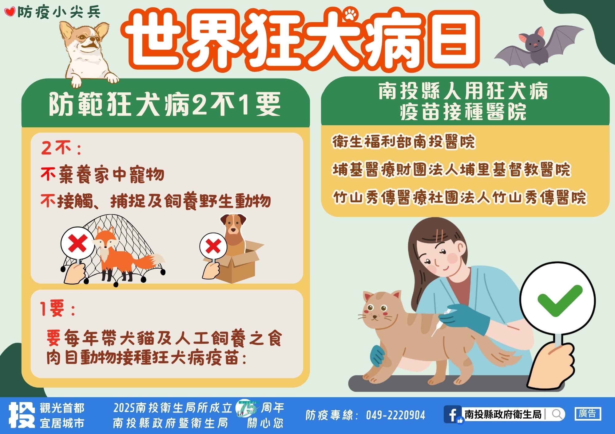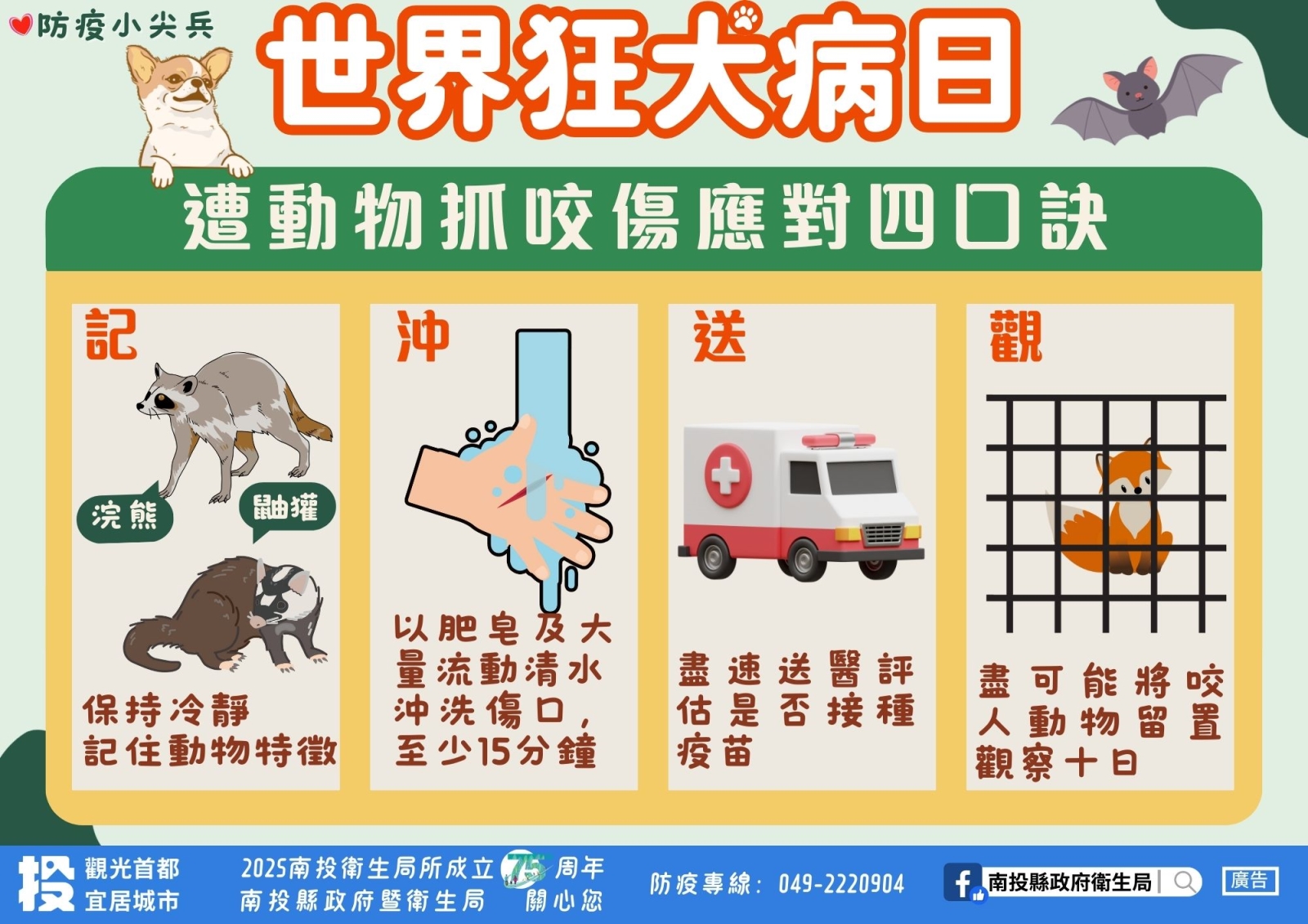 陳南松局長在此說明,防狂犬病要遵守二不一要原則,即不接觸野生動物、不棄養家中寵物,要每年帶家中犬貓等肉食目動物接種狂犬病疫苗,一旦被動物咬傷時,請遵從「記」「沖」「送」「觀」四要訣,「記」:保持冷靜,牢記動物特徵、「沖」:用大量肥皂、清水沖洗15分鐘,並以優碘消毒傷口、「送」:儘速送醫評估是否要接種疫苗、「觀」:儘可能將咬人動物繫留觀察10天;倘民眾不慎被野生動物抓、咬傷,請勿慌張,應儘速前往本縣人用狂犬病疫苗接種服務醫院(衛生福利部南投醫院、埔基醫療財團法人埔里基督教醫院及竹山秀傳醫療社團法人竹山秀傳醫院)急診就醫,由專業醫師評估給予疫苗接種及傷口處置,如有接種動物狂犬病疫苗的需求可洽本縣各鄉鎮市公所或家畜疾病防治所(洽詢專線:049-2222542),相關資訊請參閱疾管署全球資訊網(https://ntshb.tw/hc03ibNRi)或撥打免費防疫專線1922洽詢。