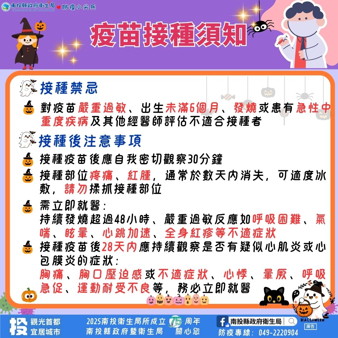 衛生局局長陳南松提醒,秋冬為呼吸道傳染病好發季節,感染呼吸道症狀者明顯增加,依據衛生福利部疾病管制署統計資料顯示上週(114年10月19日~114年10月25日)資料統計,全國類流感門急診單週就診計106,990人次,相較前一週(126,733人次)下降15.6%。南投縣類流感門急診單週就診計2,571人次,相較前一週(2,518人次)上升2.1%,顯示本縣疫情仍處流行期,呼籲尚未接種的民眾及高風險族群儘速前往合約醫療院所或衛生所接種流感及新冠疫苗,提高中重症保護力,減少疾病威脅,兩種疫苗可同時施打於不同手臂,既方便又安全。