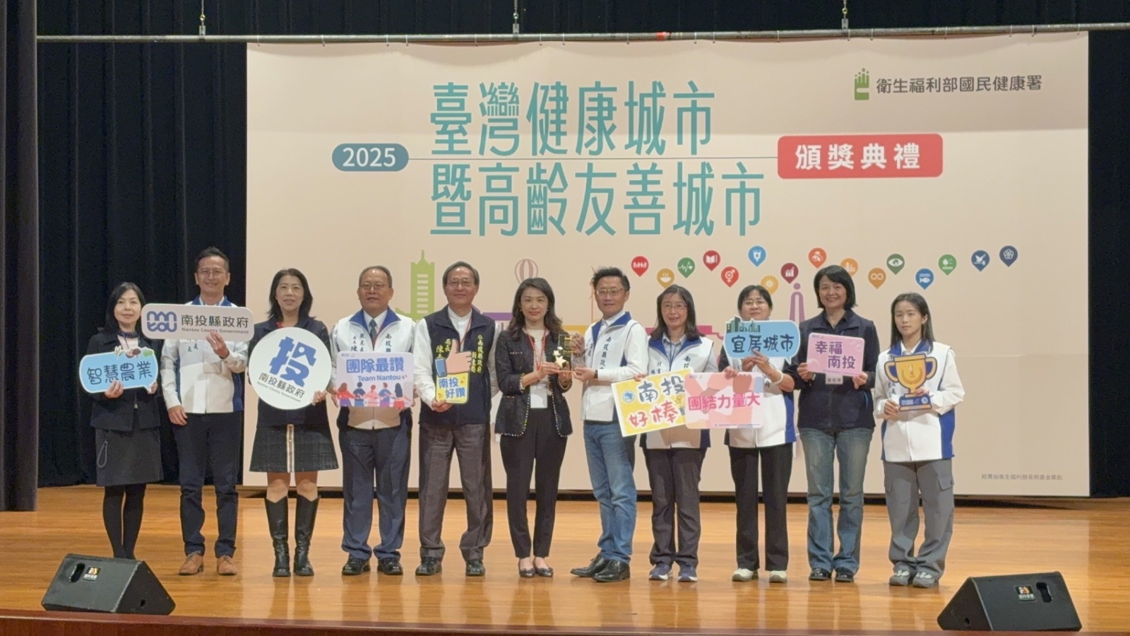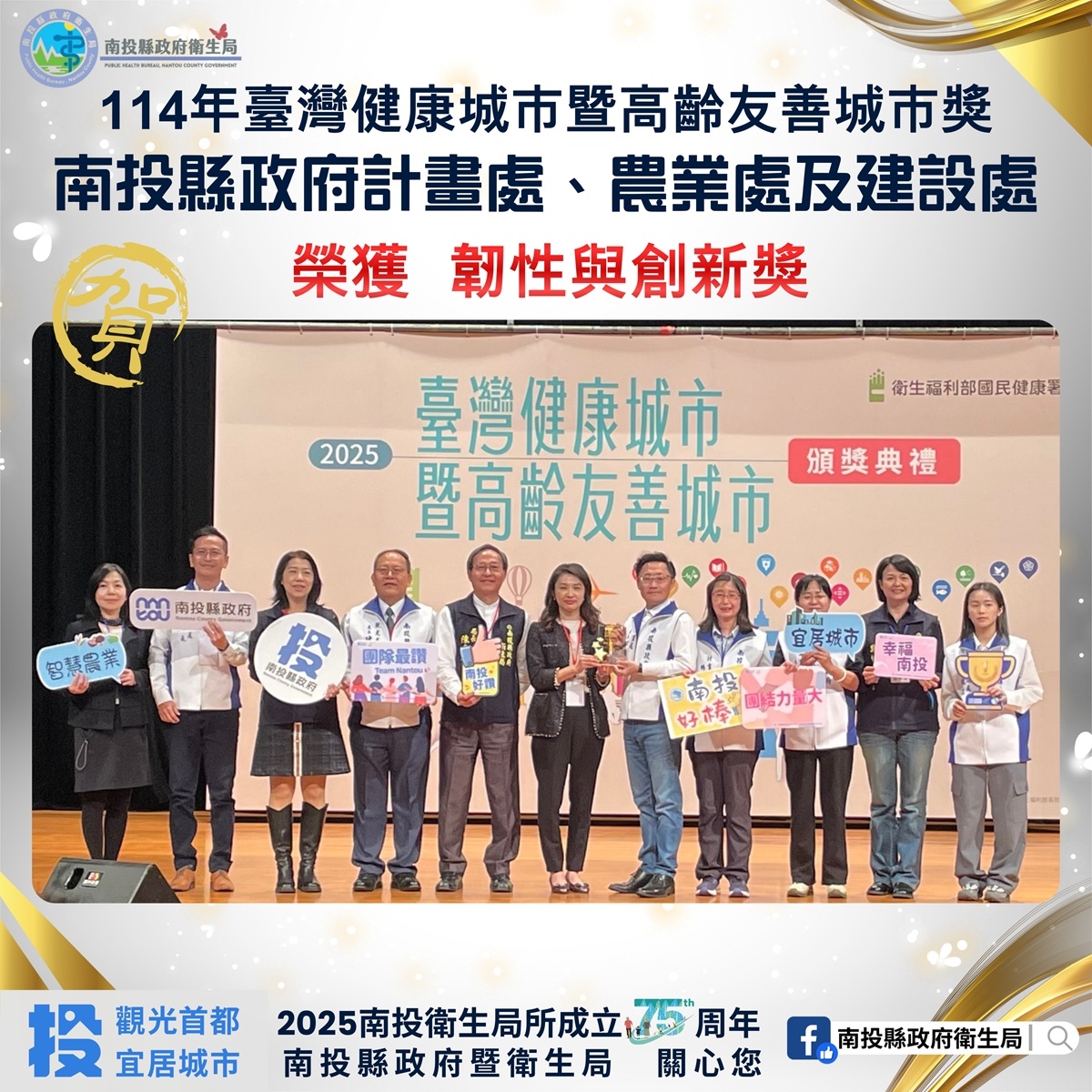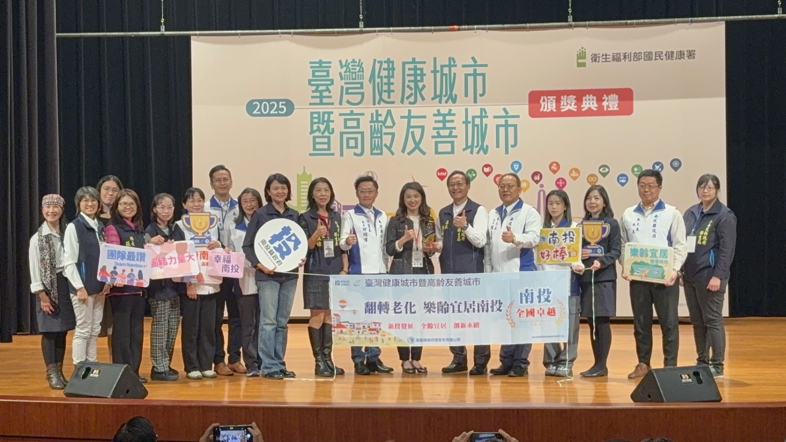 衛生福利部國民健康署今(28)日於公務人力發展學院福華國際文教會館卓越堂舉辦「114年臺灣健康城市暨高齡友善城市獎頒獎典禮」,南投縣政府在本屆大放異彩,以《翻轉老化 樂齡宜居南投》勇奪全國唯一「縣市組–卓越獎」,寫下縣市組最高榮譽的亮眼成績,由共同投稿單位首長,衛生局陳南松局長及計畫處邱紹偉處長出席代表領獎。