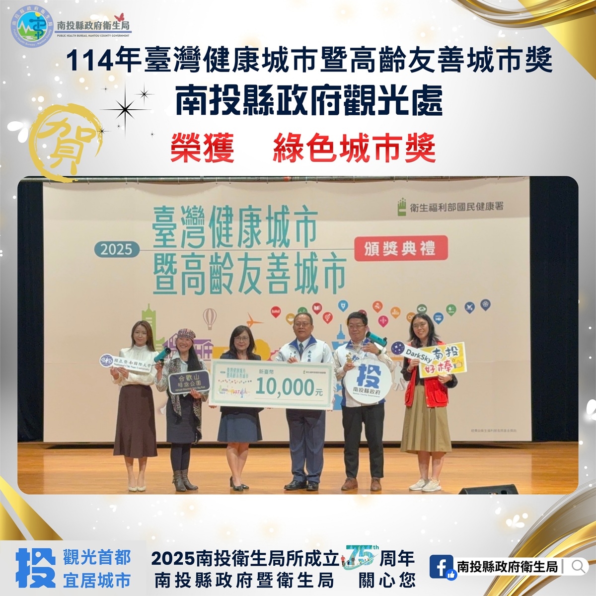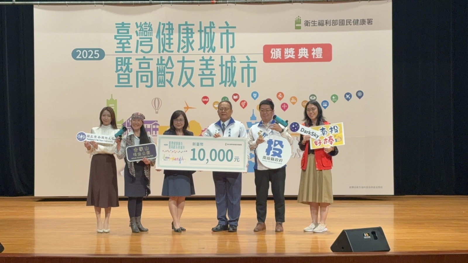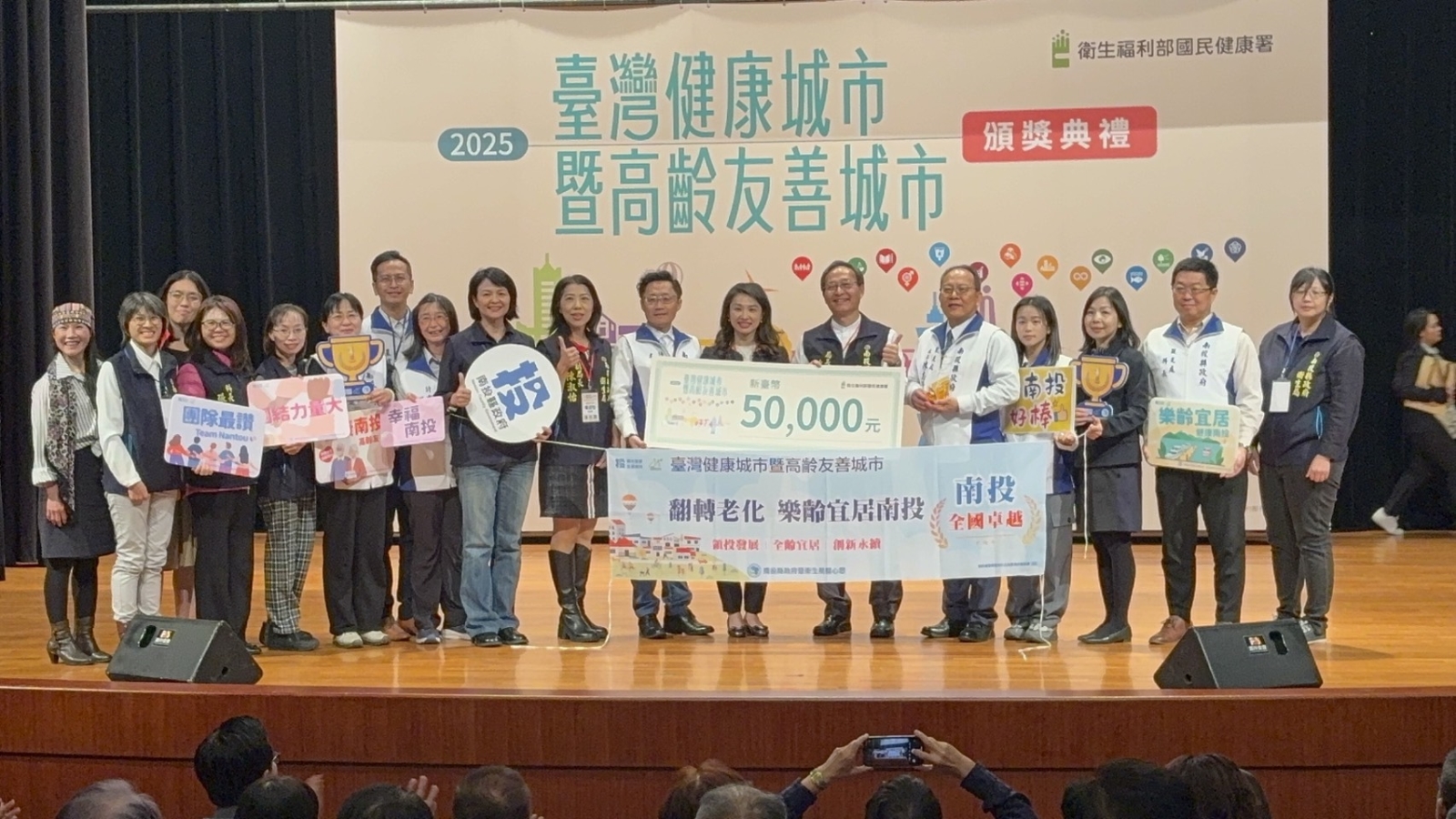 衛生福利部國民健康署今(28)日於公務人力發展學院福華國際文教會館卓越堂舉辦「114年臺灣健康城市暨高齡友善城市獎頒獎典禮」,南投縣政府在本屆大放異彩,以《翻轉老化 樂齡宜居南投》勇奪全國唯一「縣市組–卓越獎」,寫下縣市組最高榮譽的亮眼成績,由共同投稿單位首長,衛生局陳南松局長及計畫處邱紹偉處長出席代表領獎。