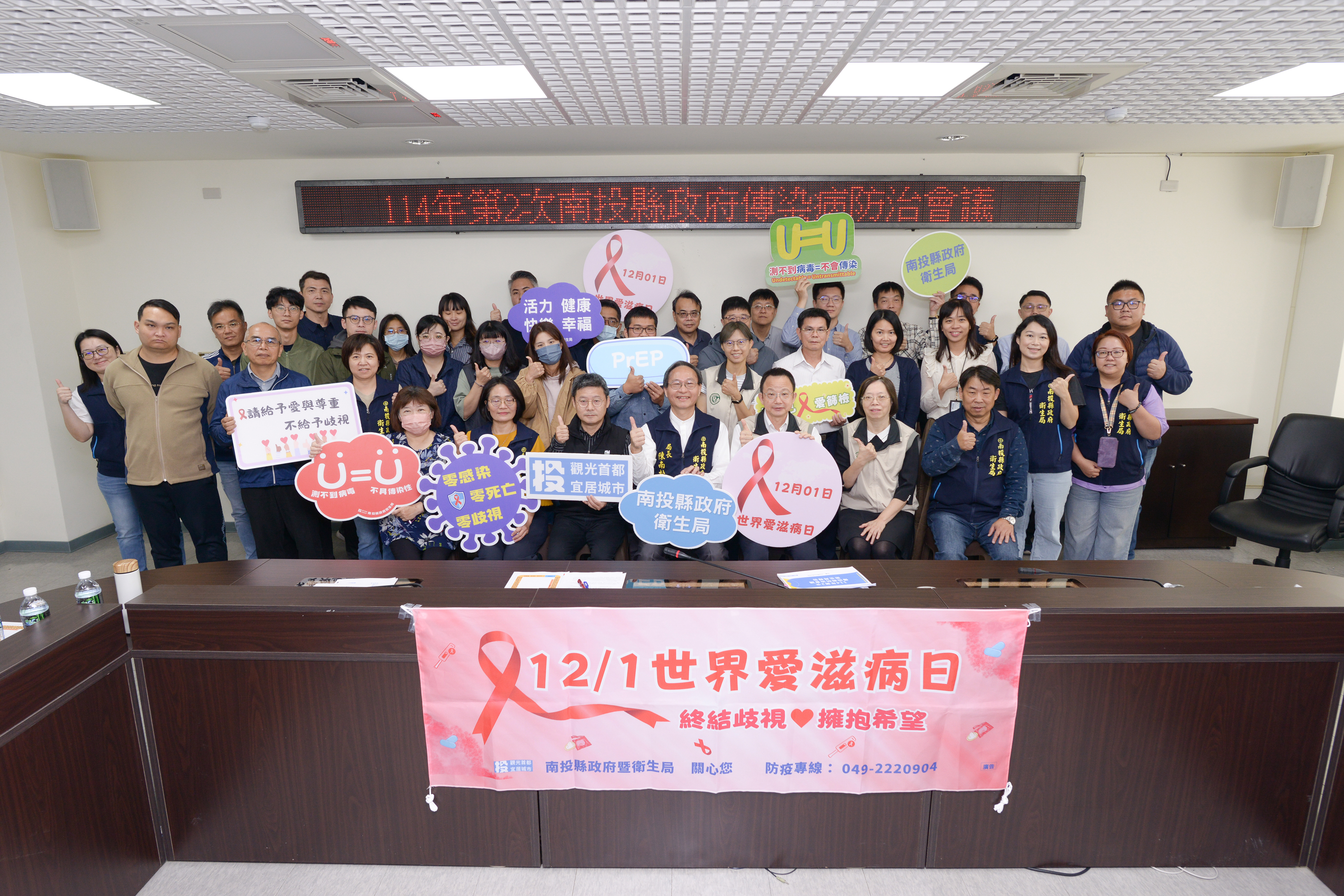 114年11月26日上午,衛生局邀集衛生福利部疾病管制署中區管制中心吳智文主任及南投縣府各局處首長共同出席,召開「114年南投縣政府傳染病防治會議」,特別將本縣性病防治現況及世界愛滋病日宣導列入重要報告,並向各局處強調愛滋防治新觀念「U=U(Undetectable = Untransmittable,病毒量測不到=不具傳染力)」,希望藉由跨單位合作,將正確防治訊息帶回各機關與社區,讓更多民眾理解:愛滋已是可被控制的慢性病,定期追蹤、穩定服藥即可避免傳播,展現中央與地方攜手推動愛滋去污名化與性健康教育的決心。
