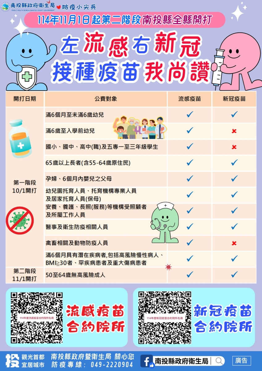 衛生局呼籲,隨著連假將至,人際互動頻繁,傳播風險上升,民眾務必防範呼吸道傳染病,並持續留意流感及新冠併發重症發生風險,若出現呼吸困難、呼吸急促、發紺、血痰、胸痛、意識改變、低血壓等危險徵兆,應儘速就醫以及時獲得治療,並呼籲長者、幼兒及慢性病患等高風險族群,本縣疫苗即將用罄,請儘速完成流感及新冠疫苗接種,獲得保護力,降低感染後發生重症和死亡之風險。並仍應保持良好衛生習慣,如勤洗手、配戴口罩及注意咳嗽禮節,共同守護自己與家人的健康,迎向安心平安的春節。有關疫苗接種相關資訊及合約醫療院所名冊均置於衛生局網站(傳染病防治專區)網址:http://www.ntshb.gov.tw,接種疫苗前請民眾先洽詢各鄉鎮市衛生所及合約醫療院所,或撥打衛生局專線2220904洽詢,