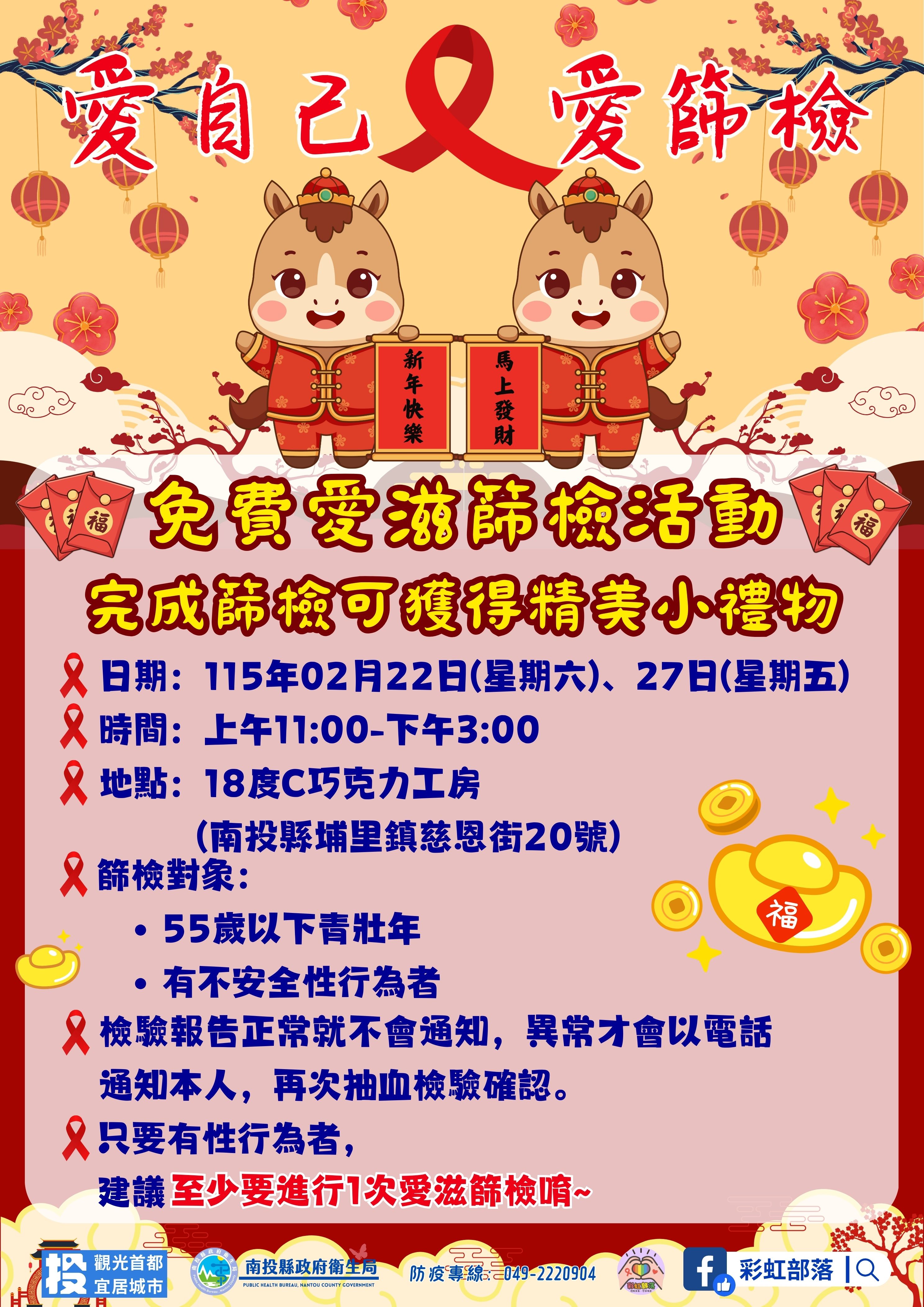 為鼓勵民眾主動關心自身健康狀況,南投縣政府衛生局將於115年2月22日(星期日)及2月27日(星期五),上午11時至下午3時,於埔里鎮18度C巧克力工房辦理2場「愛自己愛篩檢」愛滋及性病篩檢與衛教宣導活動,完成篩檢即可獲得禮券或精美宣導品,歡迎符合資格民眾踴躍參加。另對於感染風險較高者,也可諮詢醫師評估是否適合使用暴露前預防性投藥(PrEP),作為多一道防護措施。