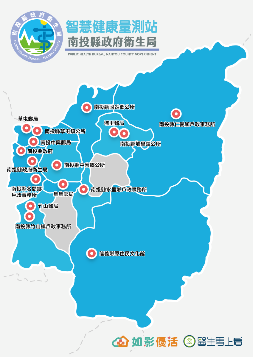 為因應高齡化社會及慢性病防治需求,南投縣政府積極推動智慧健康照護服務,於縣內建置健康量測站,導入五合一智慧量測設備,提供縣民便捷、即時的健康量測服務,並同步結合「南投縣政府健康樂活 LINE@」,串聯健康管理、醫療服務與社福資源,打造線上線下整合的一站式智慧健康照護平台,落實「健康管理・隨手掌握」的生活理念。