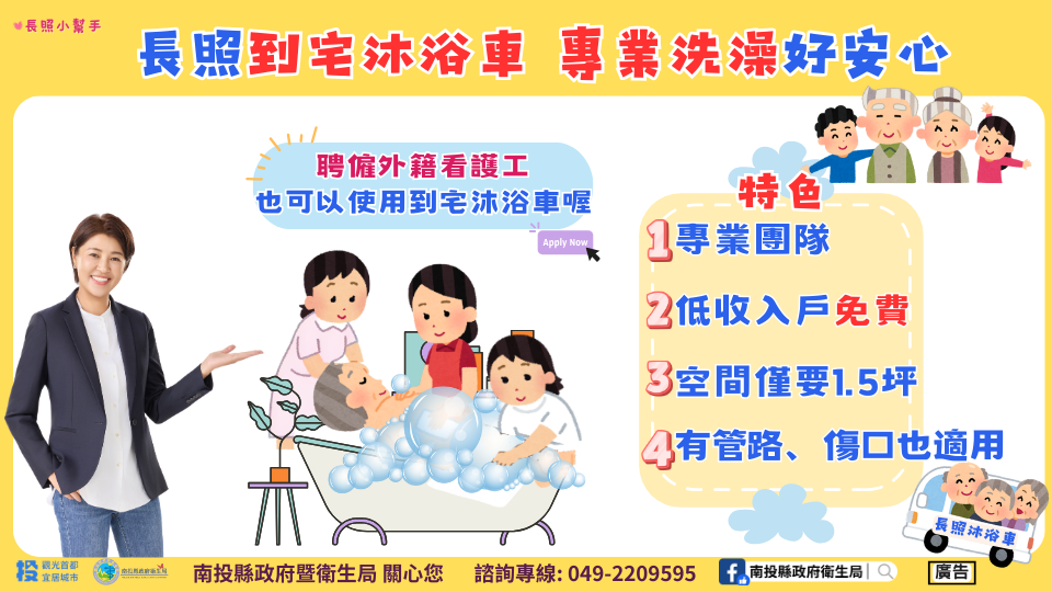 南投縣政府持續推動到宅沐浴車服務,114年1至12月已有208位失能者受惠,累計服務3818次,顯示該服務在提升居家照護便利性與安全性逐漸獲得民眾肯定與需求。目前本縣設有3家服務單位,包括:財團法人愚人之友社會福利慈善事業基金會附設私立愚人之友綜合長照機構、社團法人臺灣樂福國際慈善福利協會、東華醫院附設南投縣私立東華居家式長期照顧服務機構,服務範圍涵蓋13鄉鎮市。