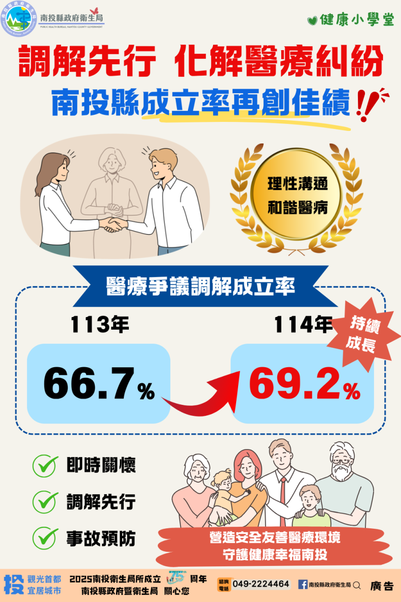 在成效方面,113年南投縣醫療爭議調解成立率達66.7%,114年更進一步提升至69.2%。這項成果彰顯本縣在制度推動上的卓越表現,也展現醫病雙方在縣府支持下能以理性、合作的方式解決糾紛。