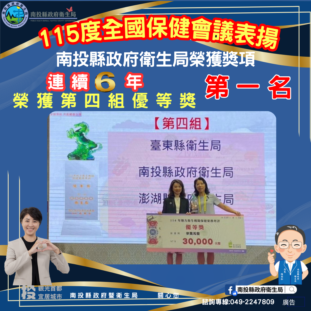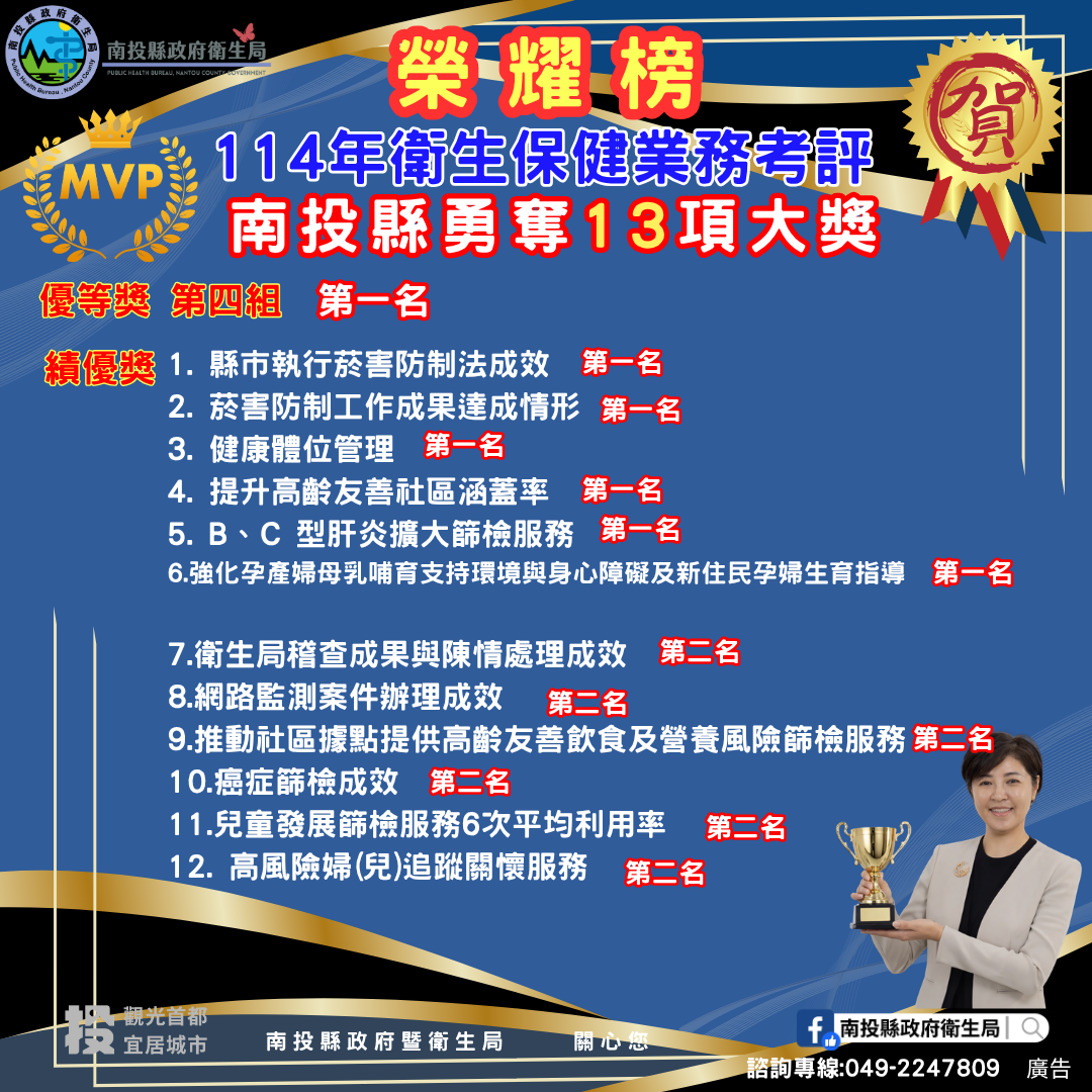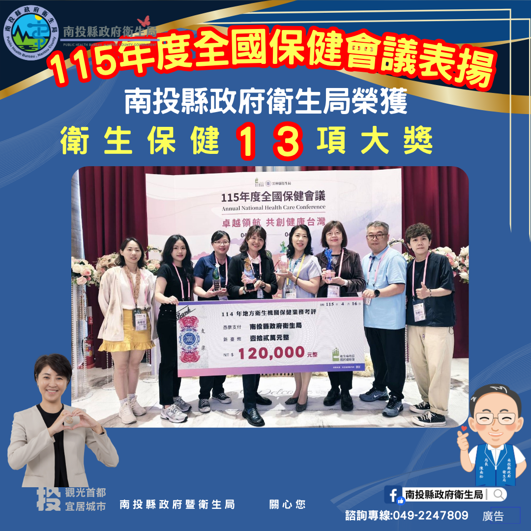 南投縣政府衛生局於4月16日、17日由衛生福利部國民健康署舉辦「115年度全國保健會議」中,榮獲114年度保健類總成績優等獎(第一名)、6項績優第一名及6 項績優第二名,合計13項大獎,展現南投縣在推動預防保健與健康促進工作的卓越成果。