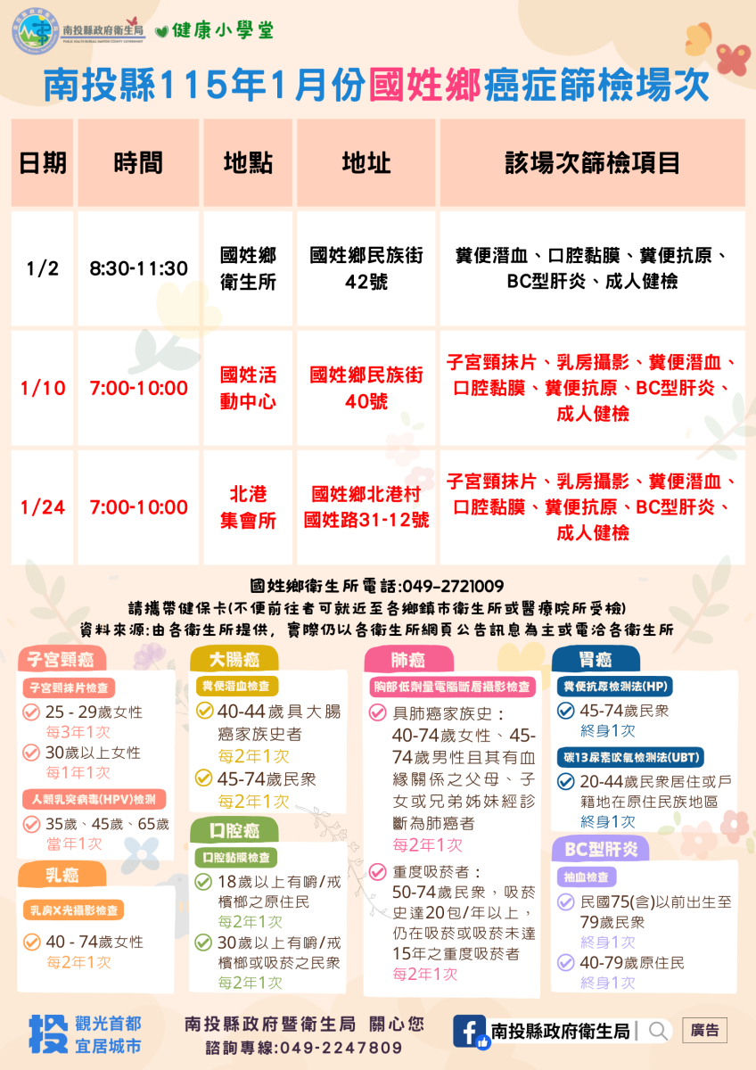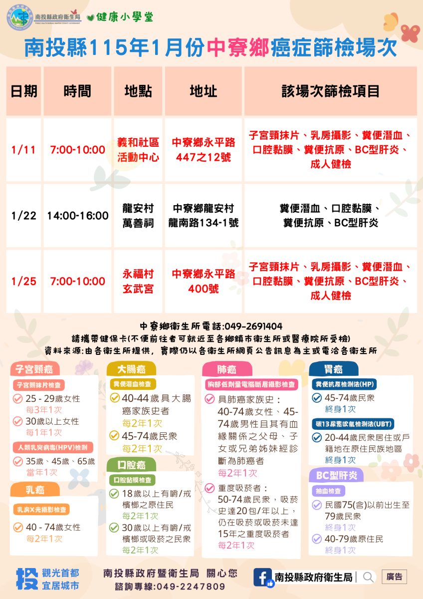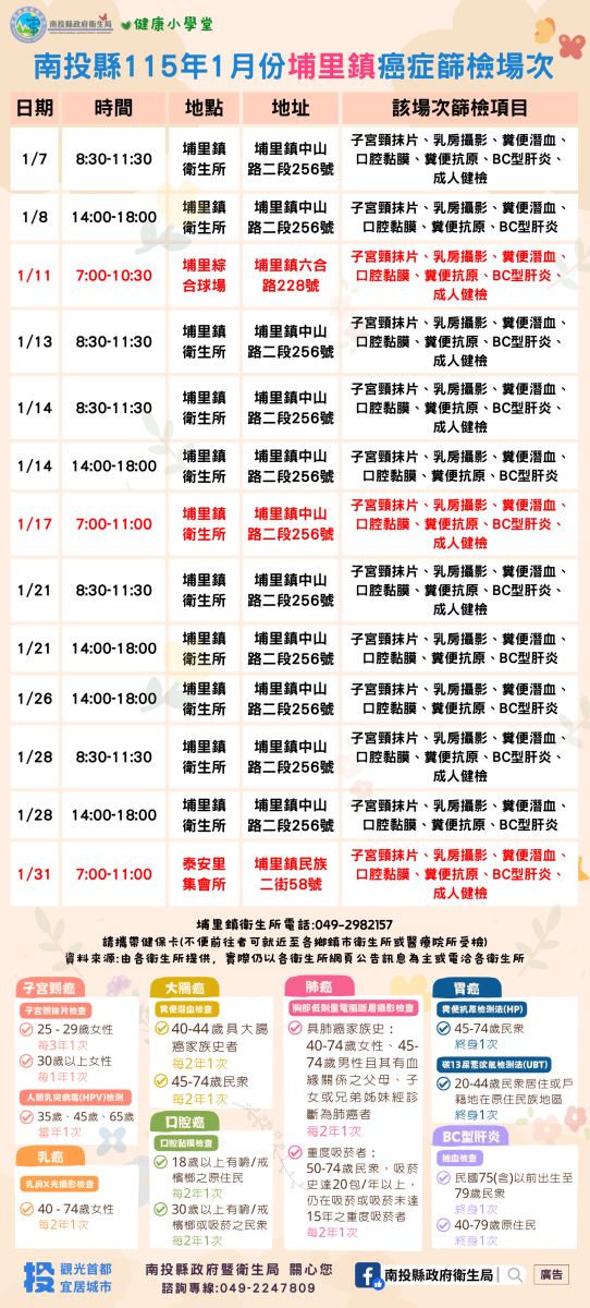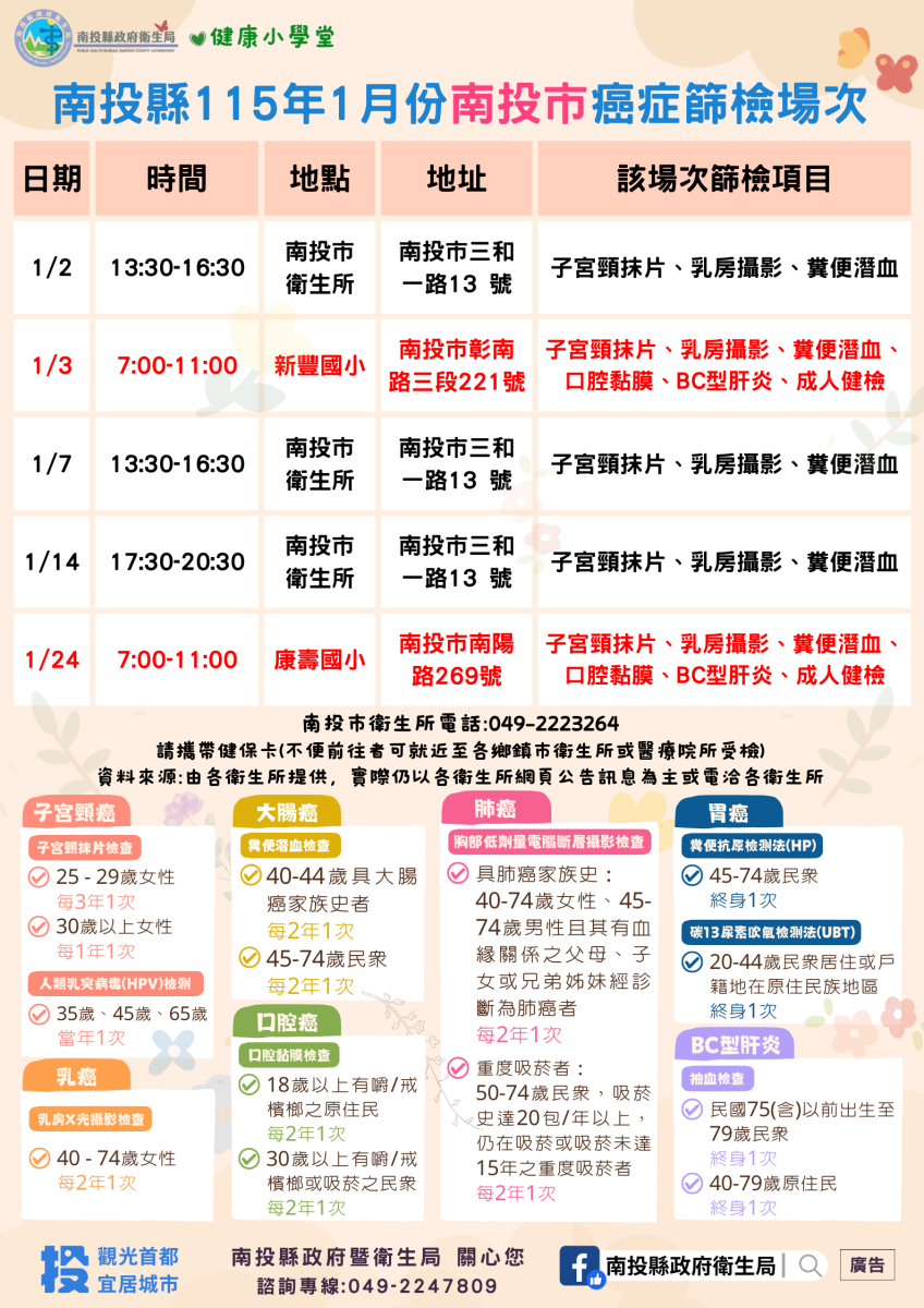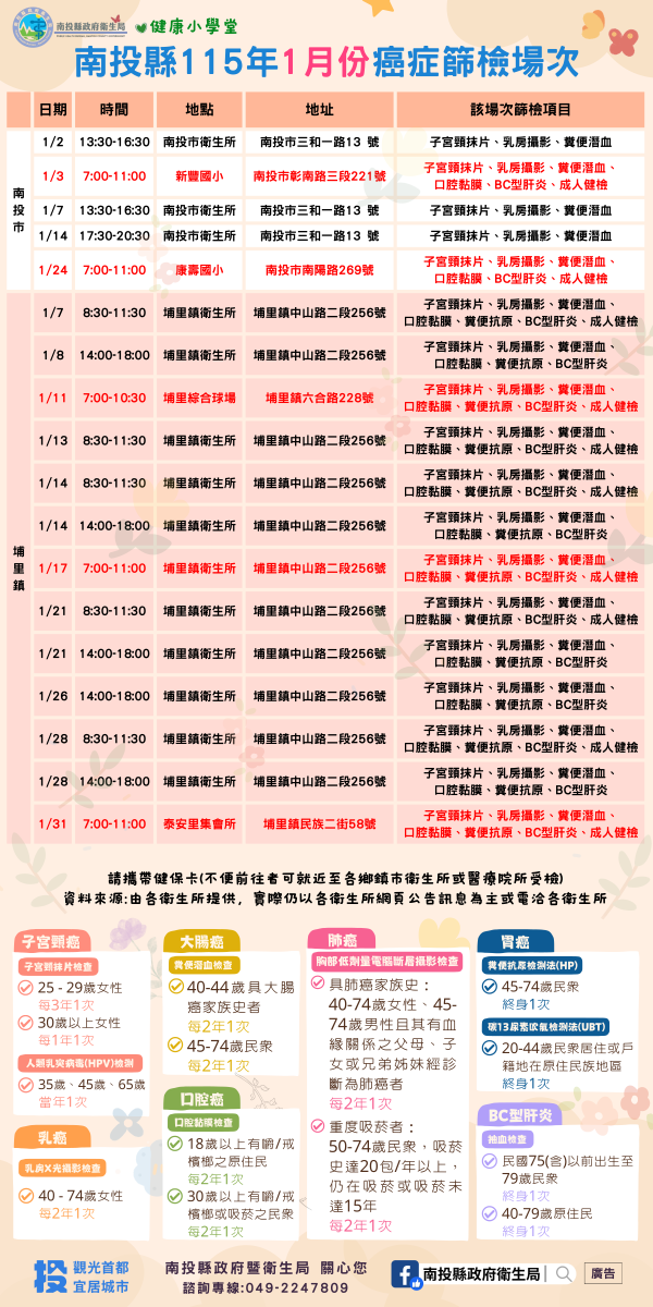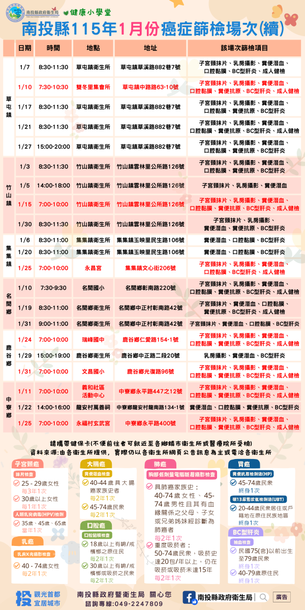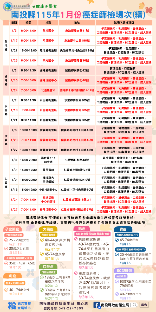 💚健康小學堂📣南投縣115年1月份成人健檢及癌症篩檢活動快訊📣