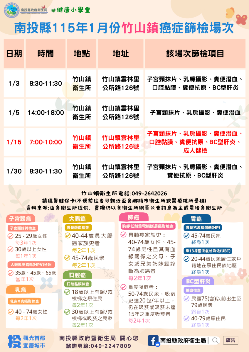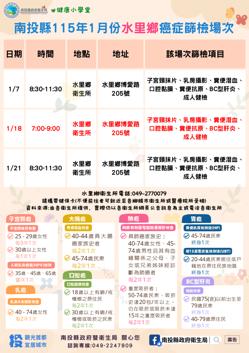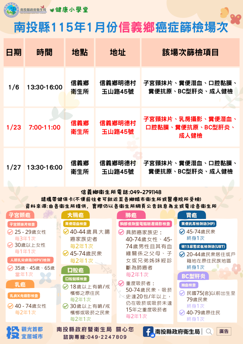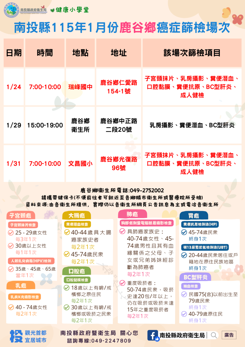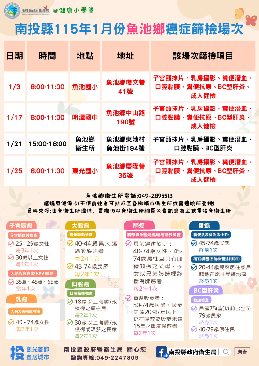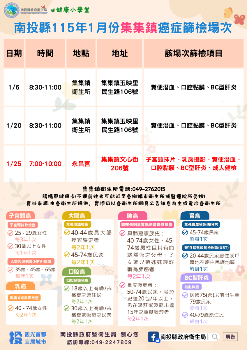 💚健康小學堂📣南投縣115年1月份成人健檢及癌症篩檢活動快訊📣