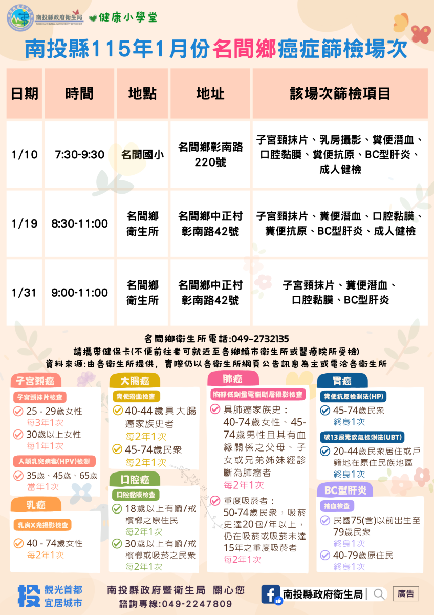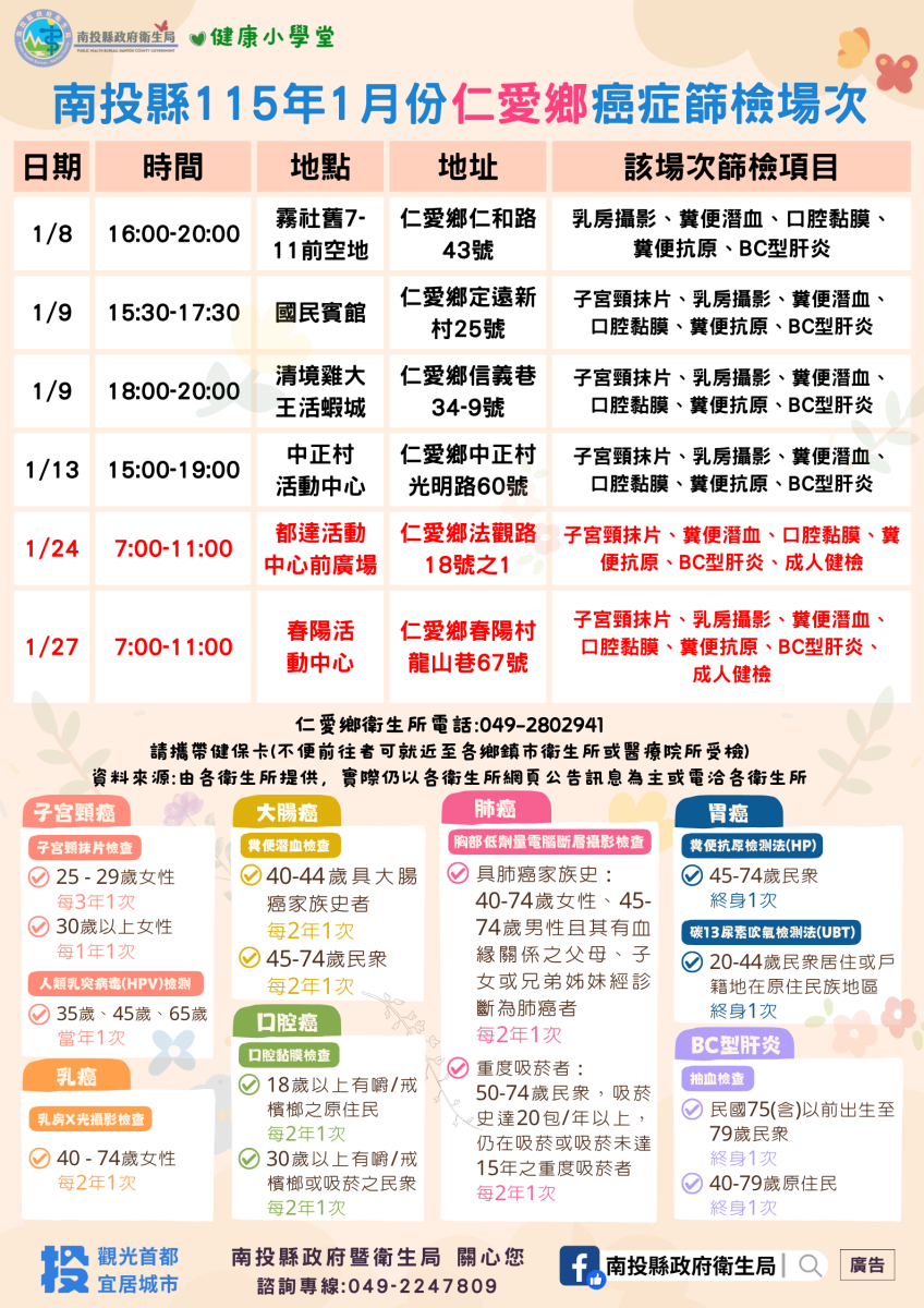 📣南投縣115年1月份成人健檢及癌症篩檢活動快訊📣