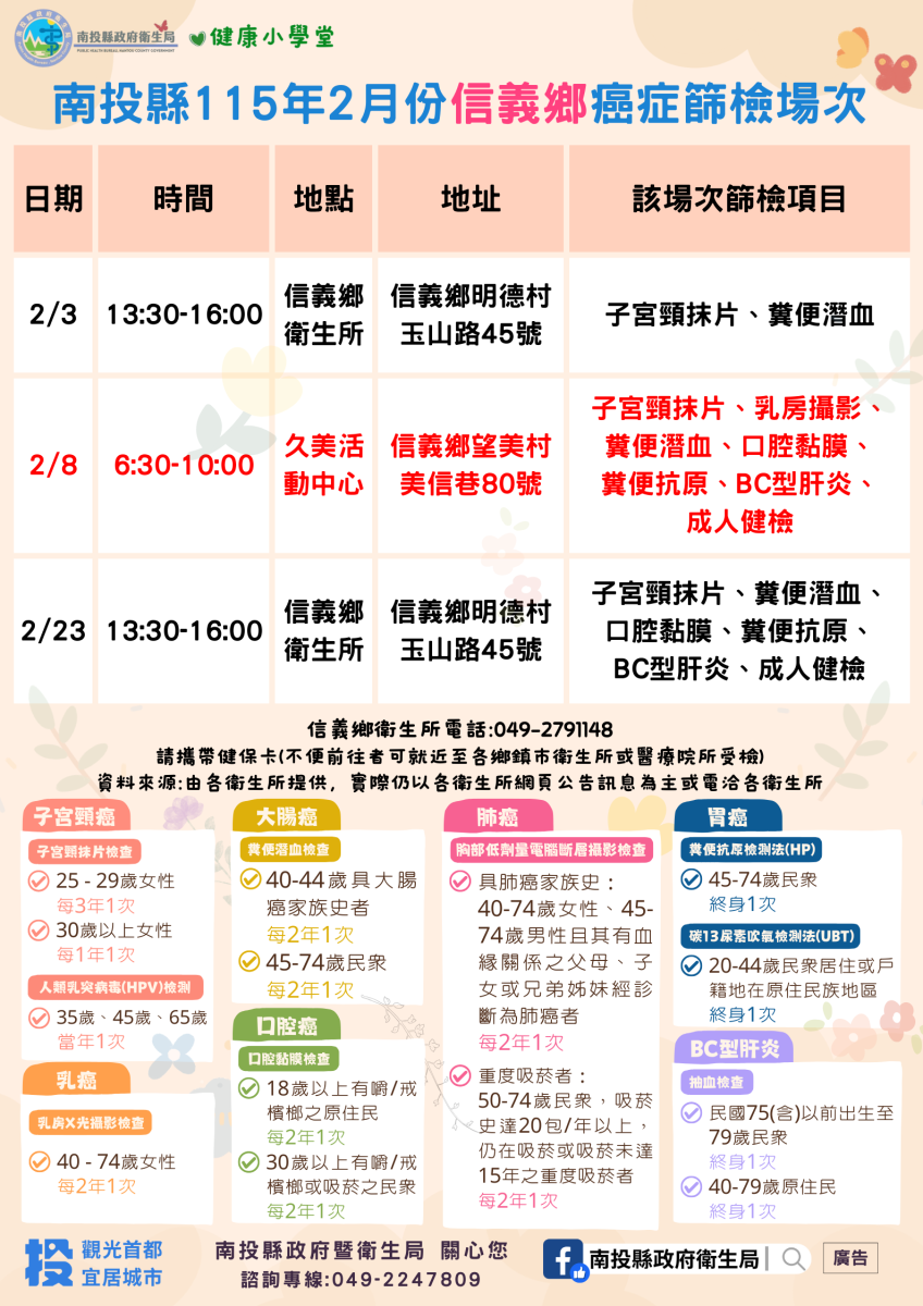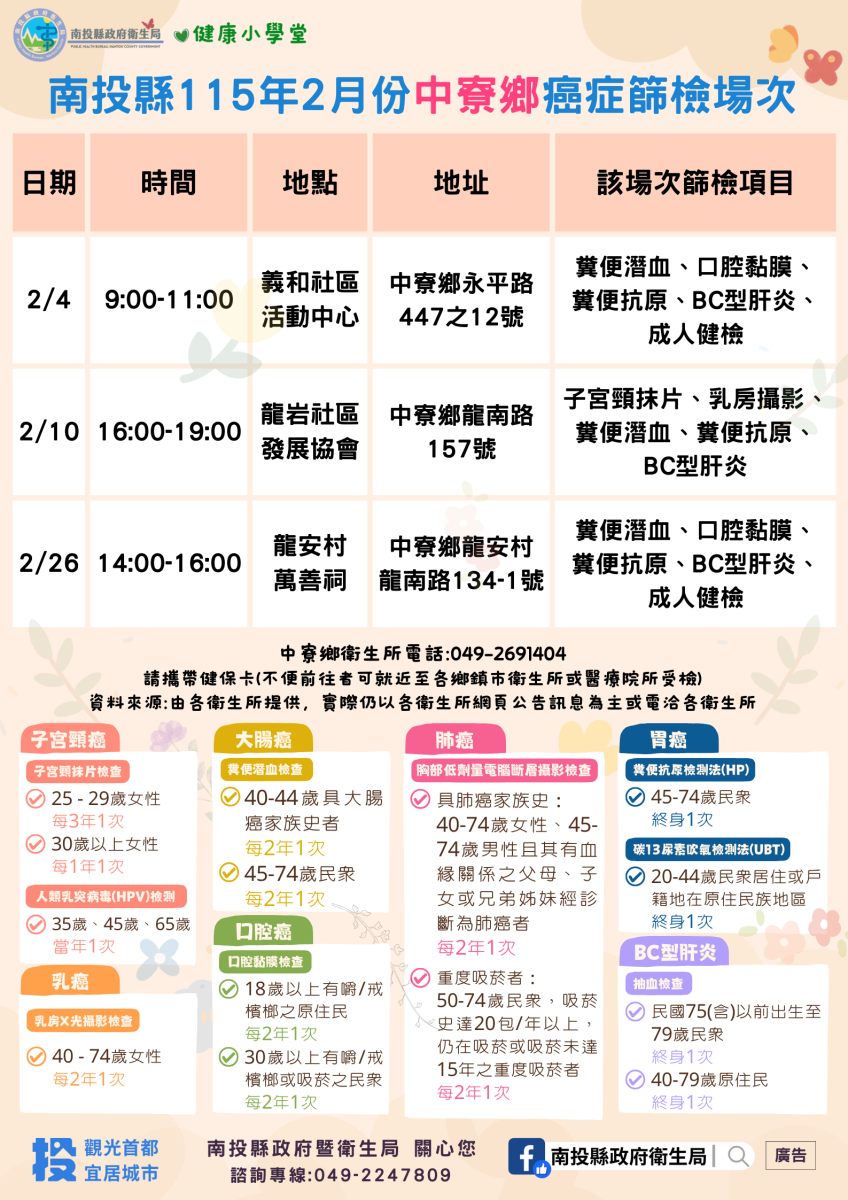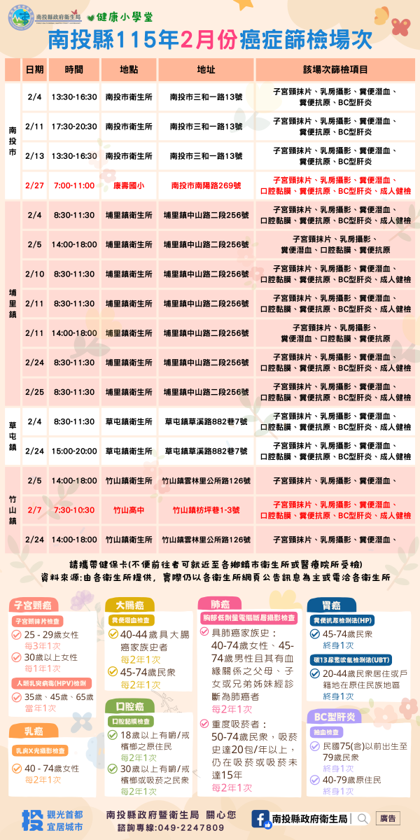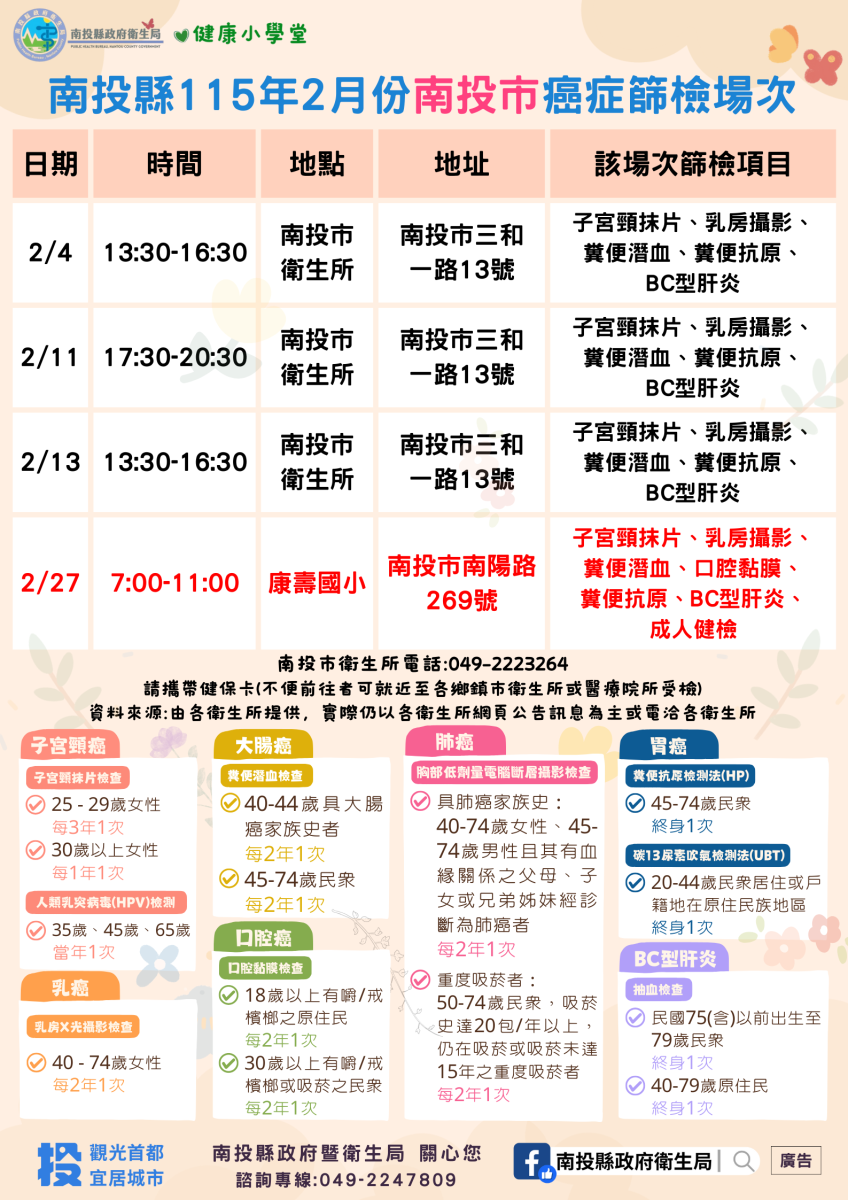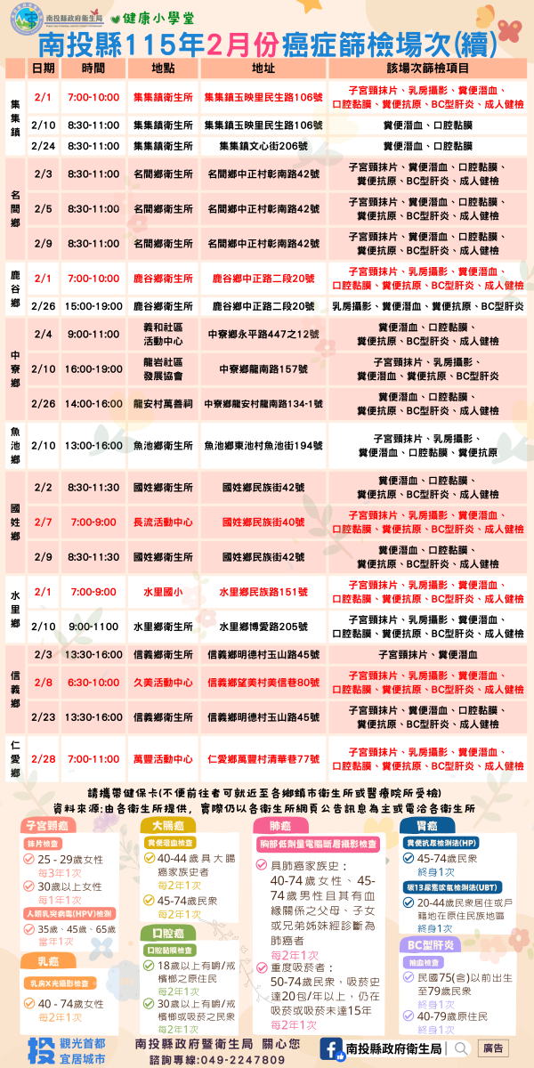 💚健康小學堂📣南投縣115年2月份成人健檢及癌症篩檢活動快訊📣