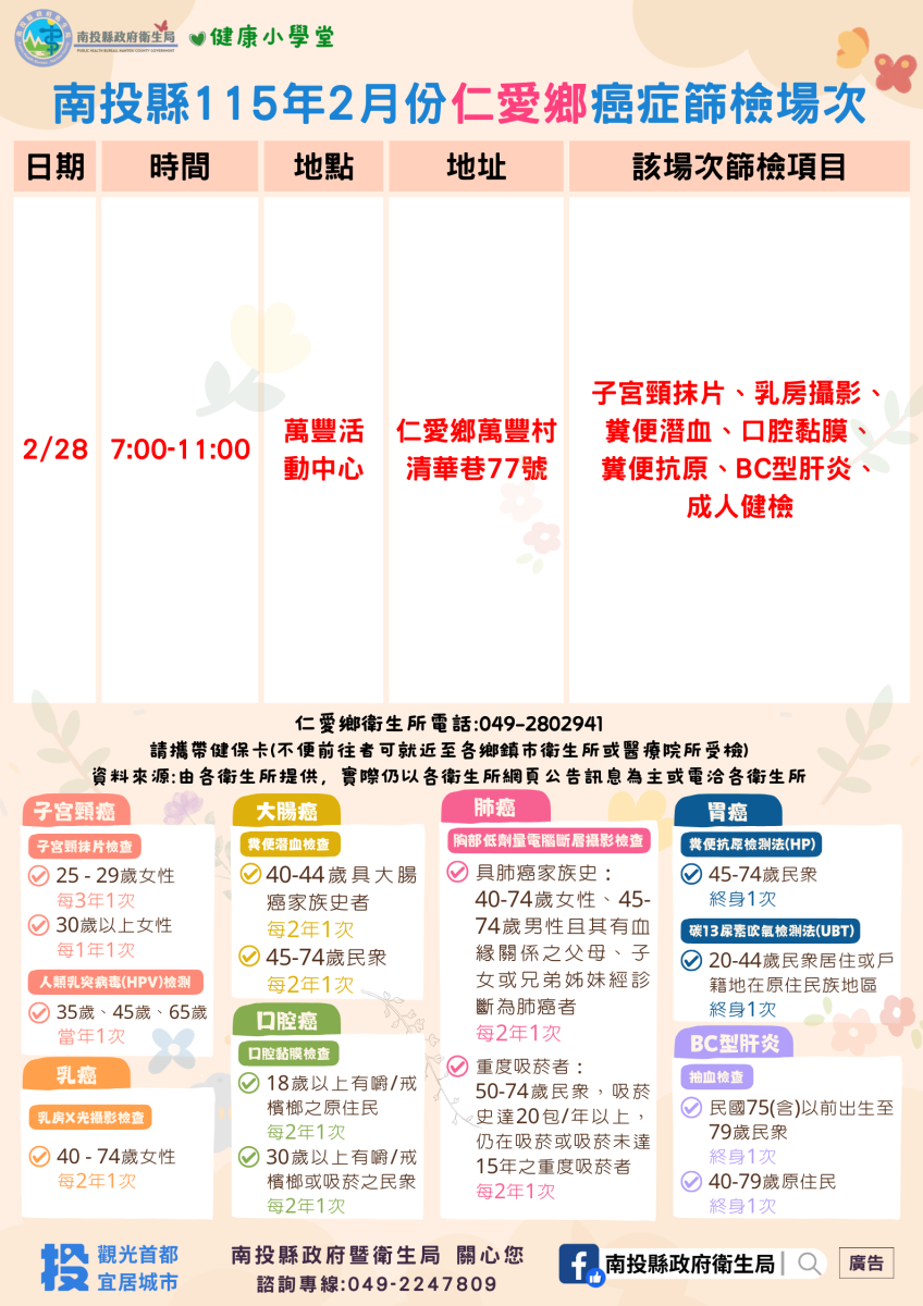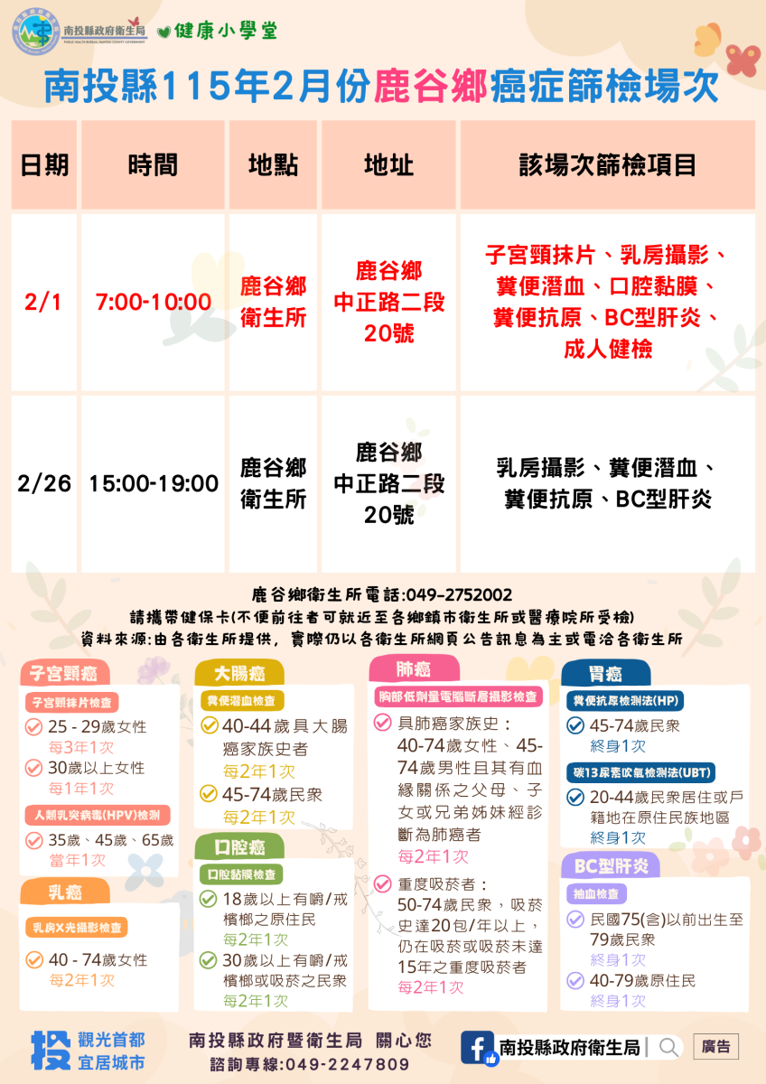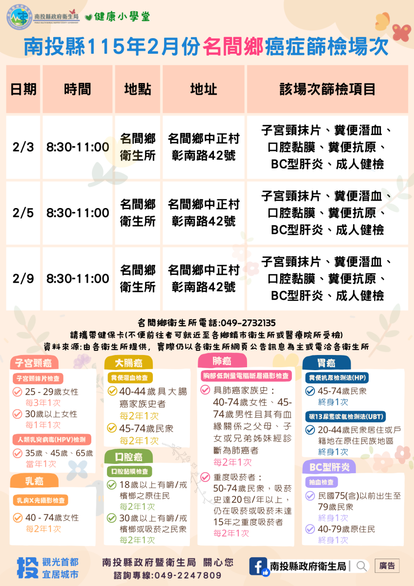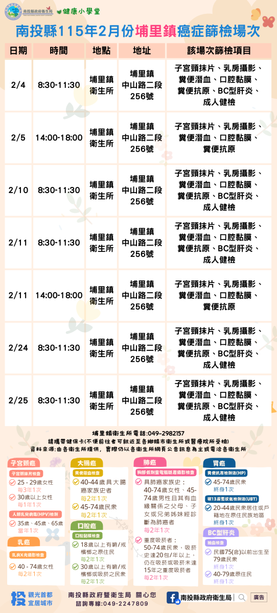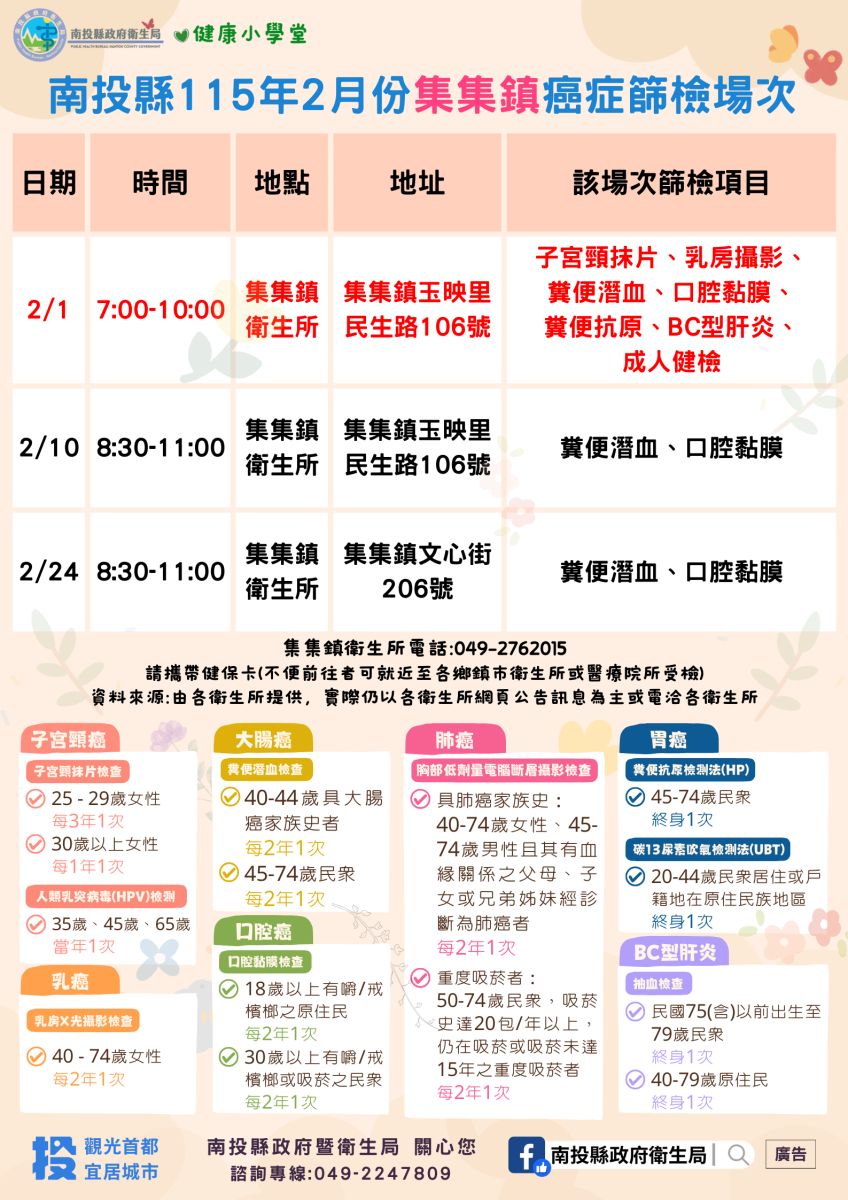 💚健康小學堂📣南投縣115年2月份成人健檢及癌症篩檢活動快訊📣