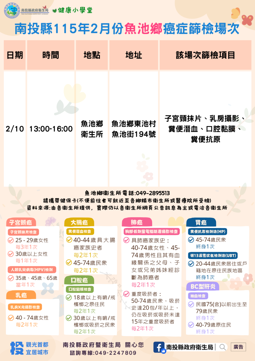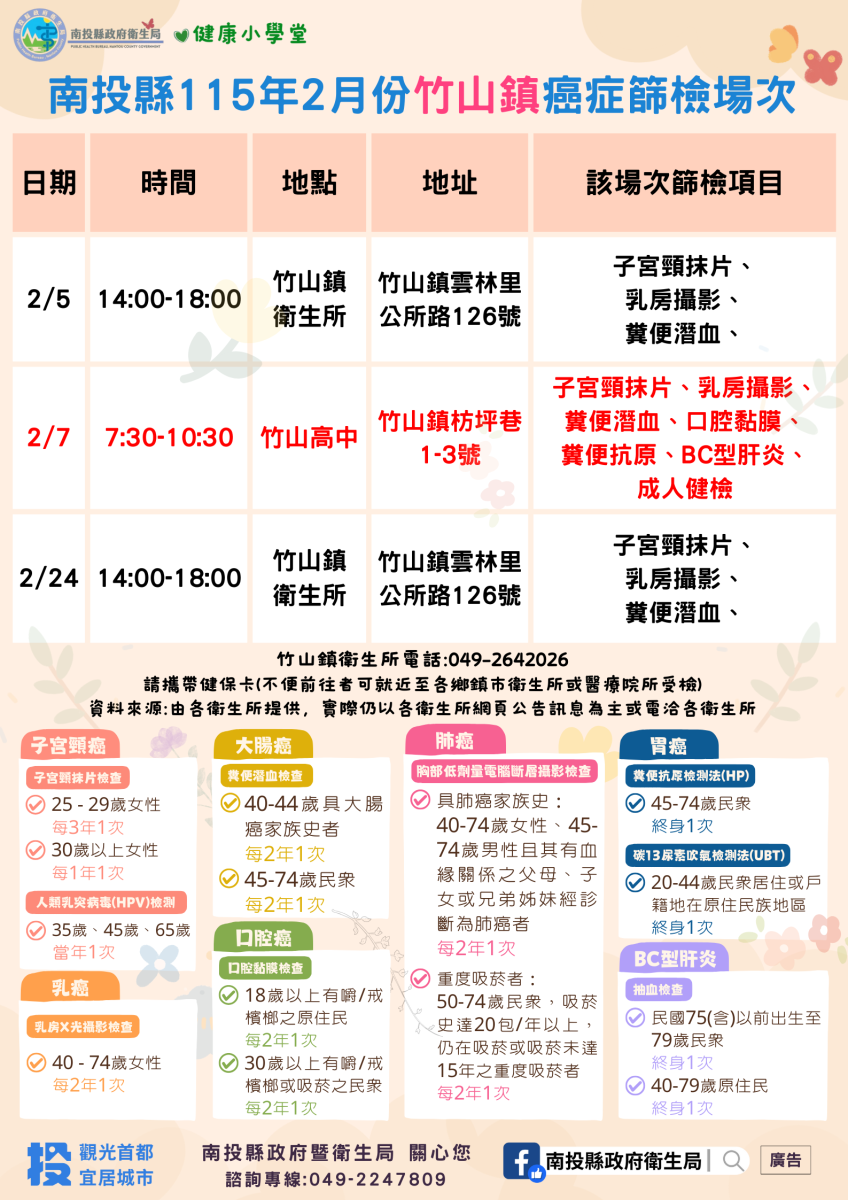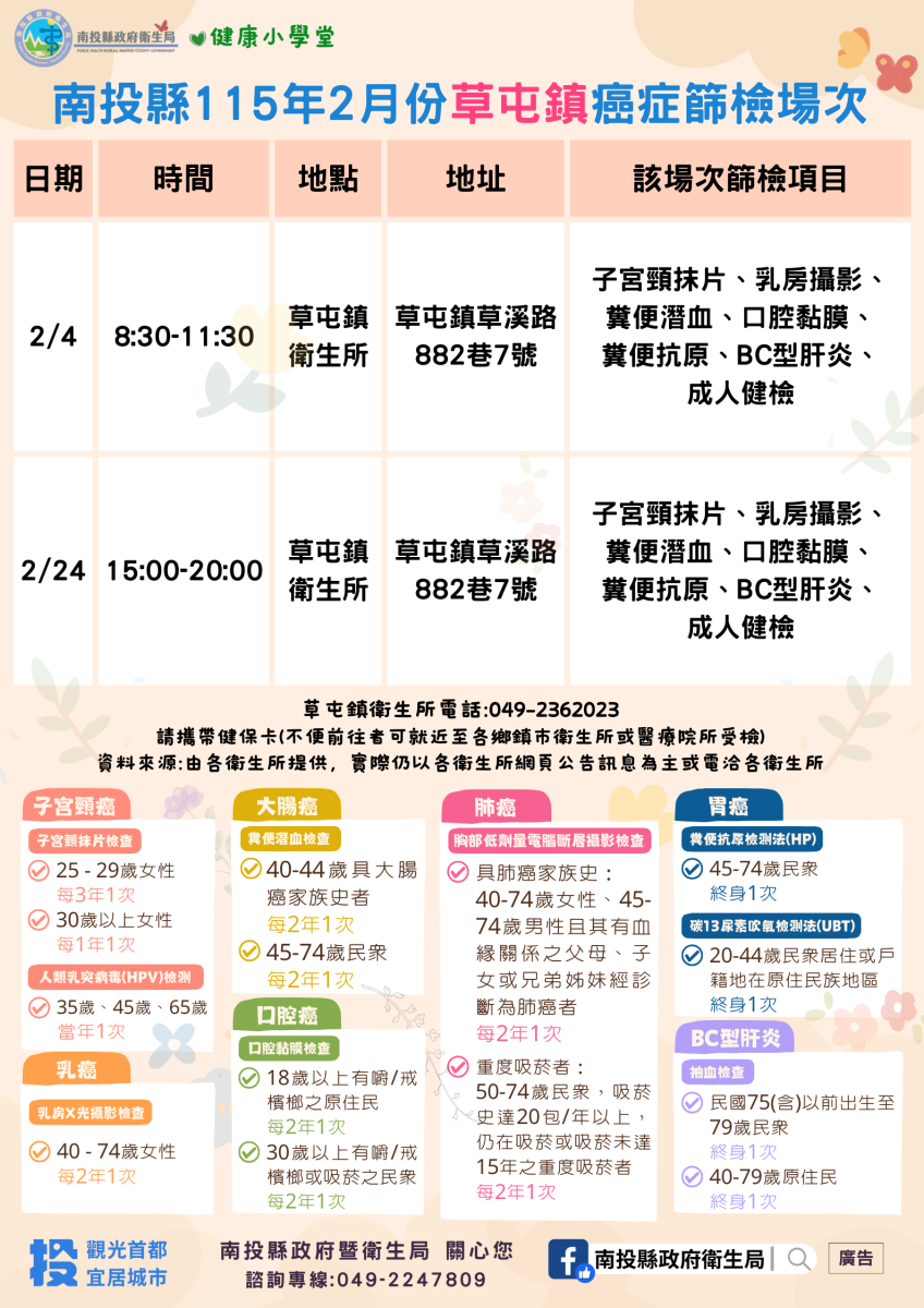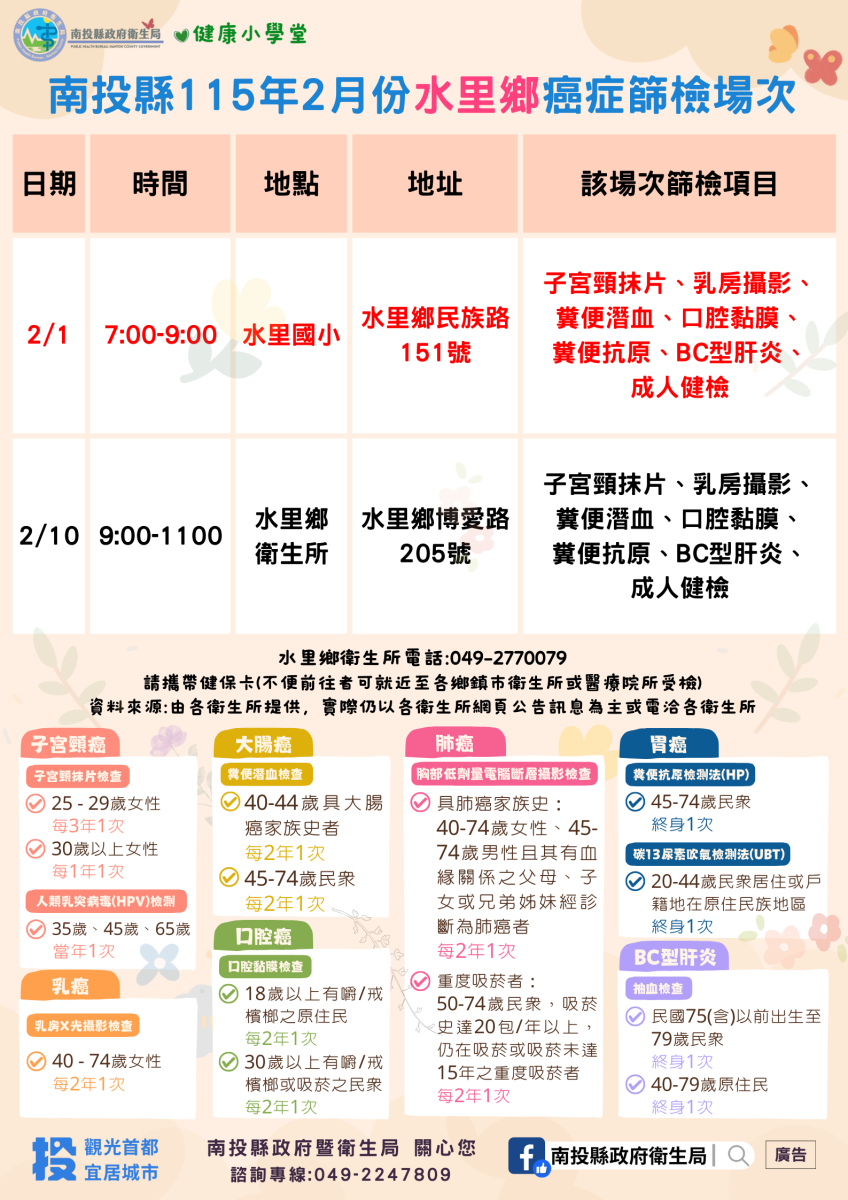 💚健康小學堂📣南投縣115年2月份成人健檢及癌症篩檢活動快訊📣